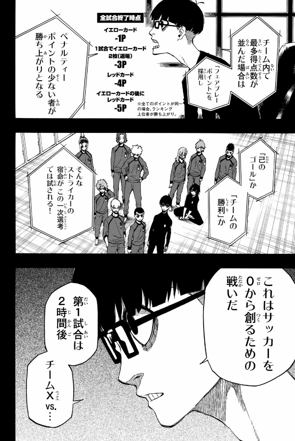 ブルーロック 2 - BURUU ROKKU 2018年、W杯。日本代表は無残に散った。今大会もベスト16止まり…。アジアでは強豪? 組織力は世界レベル? そんなことは、もう聞き飽きた! 課題は、絶対的な「エースストライカー」の不在。悲願“W杯優勝”のために、ゴールに飢え、勝利に渇き、試合を一変させる革新的な“1人”を作るべく、日本フットボール連合は300人のユース年代の選手達を招集する。まだ無名の高校2年生・潔世一は、己のエゴを以って299人を蹴落とし、最強のエースストライカーの道を駆け上れるか!? 登場人物、全員“俺様”! 史上最もイカれたエゴイストFWサッカー漫画、ここに開幕!! 国民とマスコミの過熱する批判の目と、日本が誇る天才MF・糸師 冴の冷たい闘志の視線を受け、いよいよ“青い監獄”のトレーニングが幕を開ける。5チーム中2チームが勝ち残る総当たりリーグ戦で、潔達チームZは、全員FWで行う初めての試合に大苦戦! 勝ち上がるために必要なのは自分だけの“武器”!? エゴを開花させる“武器”を見つけ、蹴落とせ自分以外! なりてぇだろ!? 世界一!!