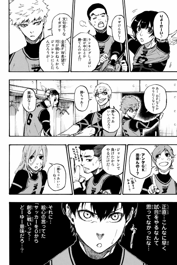 ブルーロック 12 2018年、W杯。日本代表は無残に散った。今大会もベスト16止まり…。アジアでは強豪? 組織力は世界レベル? そんなことは、もう聞き飽きた! 課題は、絶対的な「エースストライカー」の不在。悲願“W杯優勝”のために、ゴールに飢え、勝利に渇き、試合を一変させる革新的な“1人”を作るべく、日本フットボール連合は300人のユース年代の選手達を招集する。まだ無名の高校2年生・潔世一は、己のエゴを以って299人を蹴落とし、最強のエースストライカーの道を駆け上れるか!? 登場人物、全員“俺様”! 史上最もイカれたエゴイストFWサッカー漫画、ここに開幕!! 二次選考を勝ち抜き、出揃ったストライカーは35名!! ”青い監獄(ブルーロック)”の存続を懸け、総力で挑むはUー20日本代表との決戦試合!! ”青い監獄”レギュラーとして出場する11人を選ぶ、『適性試験』が幕を開ける!! TOP6 FWを超え、潔は自分を主張できるか!?