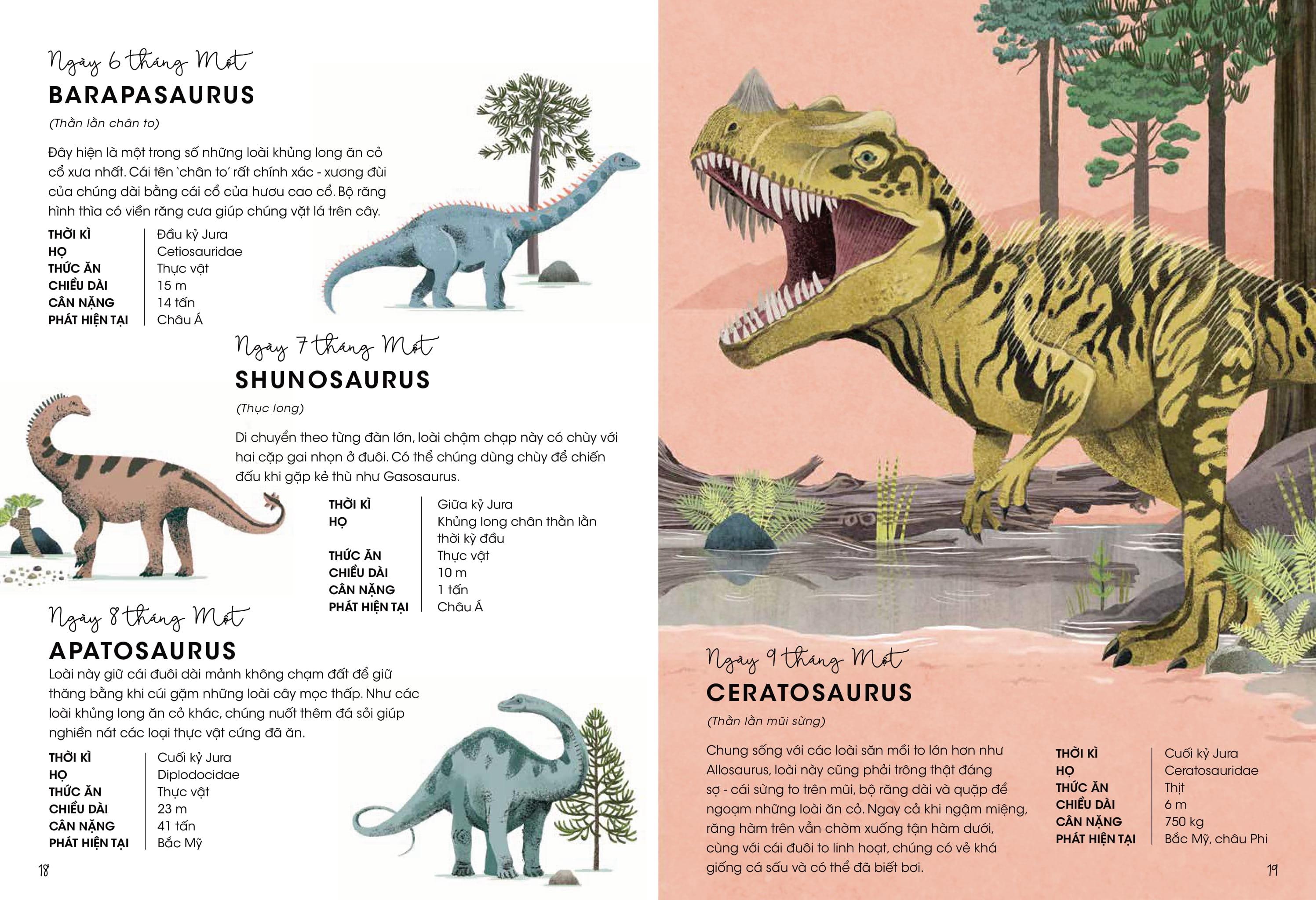 365 Ngày Khủng Long Cuốn sách ‘365 ngày khủng long’ mời bạn cùng du hành vào một thế giới cổ xưa và kỳ lạ. Trong cuộc gặp gỡ khó quên kéo dài suốt 365 ngày này, bạn sẽ được gặp đủ các loài khủng long, từ hiền lành tới hung dữ, từ nhỏ bằng bàn tay cho tới lớn như tòa nhà. Bạn sẽ thấy những cái tên quen thuộc và lạ lẫm, cùng với những loài mới được phát hiện, tất cả đều trở nên sống động với những hình ảnh minh họa tuyệt đẹp và các thông tin hấp dẫn.