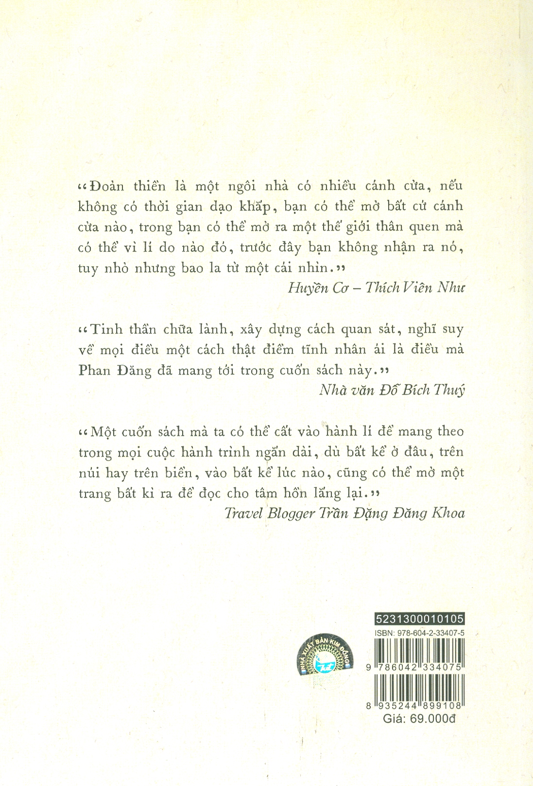 “Tinh thần chữa lành, xây dựng cách quan sát, nghĩ suy về mọi điều một cách thật điềm tĩnh nhân ái là điều mà Phan Đăng đã mang tới trong cuốn sách này.”- Nhà văn Đỗ Bích Thuý
