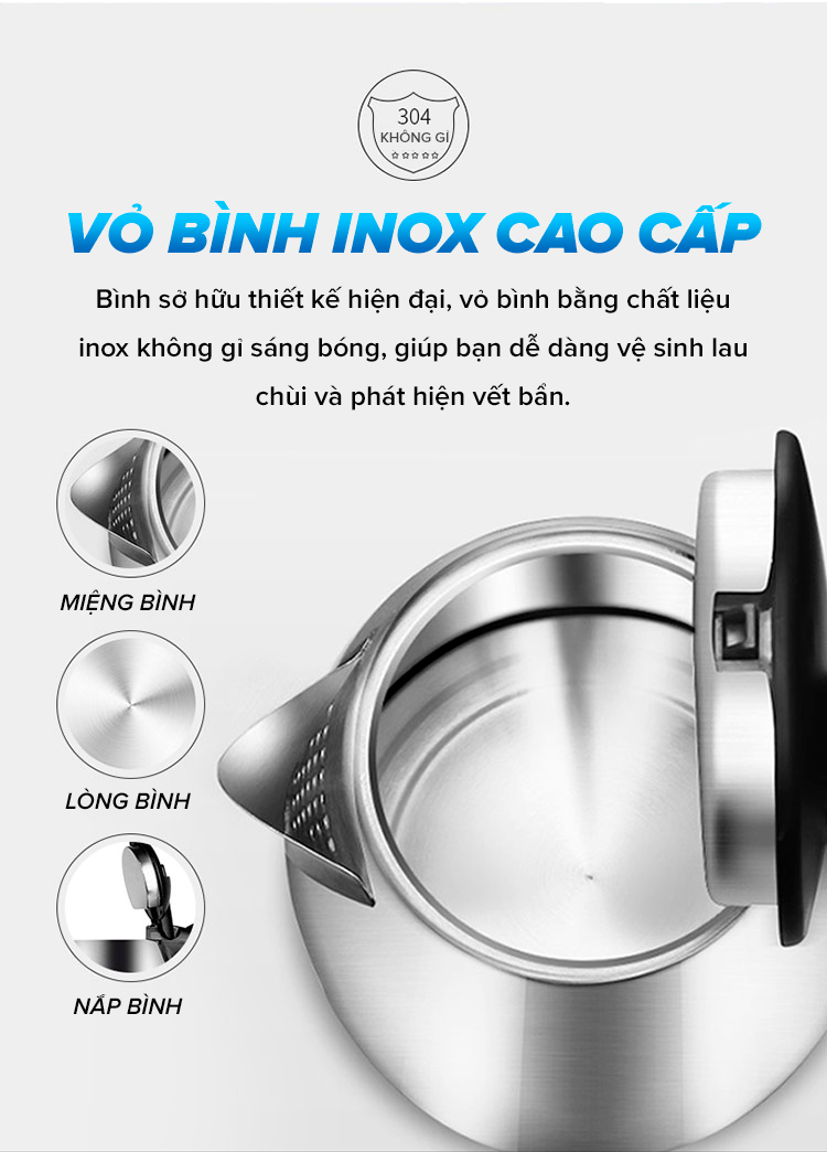 Đặc điểm nổi bật: - Thân ấm gồm 2 lớp: bên trong là inox 304 siêu bền và bên ngoài là nhựa PP cách nhiệt - Chế độ tự động tắt khi nước sôi, cạn