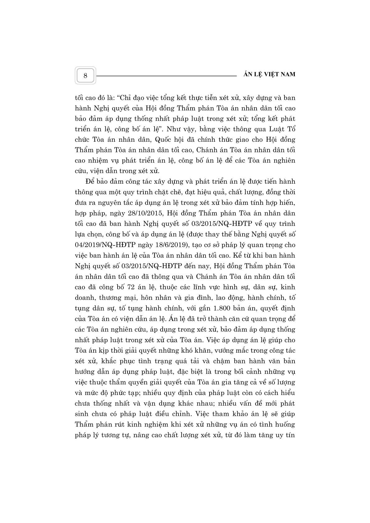 Với mong muốn cung cấp cho các Thẩm phán, Thẩm tra viên, Thư ký Tòa án, các cơ sở nghiên cứu, đào tạo chuyên ngành luật, độc giả quan tâm đến án lệ những kiến thức chung về án lệ, kỹ năng nghiên cứu, áp dụng án lệ trong xét xử cũng như toàn cảnh quá trình phát triển án lệ ở Việt Nam, Tòa án nhân dân tối cao tiến hành nghiên cứu, biên soạn cuốn sách Án lệ Việt Nam do GS.TS. Nguyễn Hòa Bình Ủy viên Bộ Chính trị, Bí thư Trung ương Đảng, nguyên Chánh án Tòa án nhân dân tối cao làm Chủ biên, cùng với sự tham gia của các Thẩm phán Tòa án nhân dân tối cao, chuyên gia, nhà khoa học hàng đầu về án lệ. Cuốn sách dự kiến mang đến cho người đọc nhận thức chung về quan niệm, đặc điểm và lịch sử hình thành án lệ trên thế giới và ở Việt Nam, vai trò của án lệ, mối quan hệ giữa pháp luật và án lệ; giới thiệu, phân tích, làm rõ các quy định của pháp luật Việt Nam về án lệ, chia sẻ về thực tiễn ban hành, áp dụng án lệ cũng như định hướng phát triển án lệ của Tòa án. Cuốn sách là tài liệu hướng dẫn cho các Thẩm phán, Hội thẩm và các chức danh tư pháp của Tòa án về các kỹ năng cần thiết trong việc tìm hiểu, nghiên cứu án lệ, viện dẫn án lệ trong các bản án, quyết định hình sự, hành chính, dân sự, hôn nhân và gia đình, kinh doanh, thương mại, lao động của Tòa án.