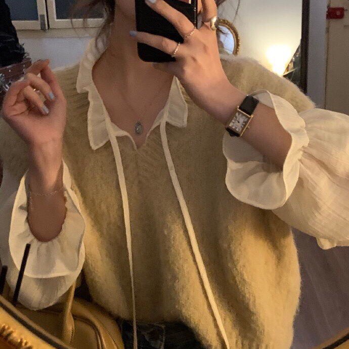 Áo Len Xám Mix Cổ Sơ Mi Xanh – item thời trang trẻ trung, dễ phối đồ Thiết kế: Áo len xám basic, điểm nhấn cổ sơ mi xanh nổi bật, mang đến phong