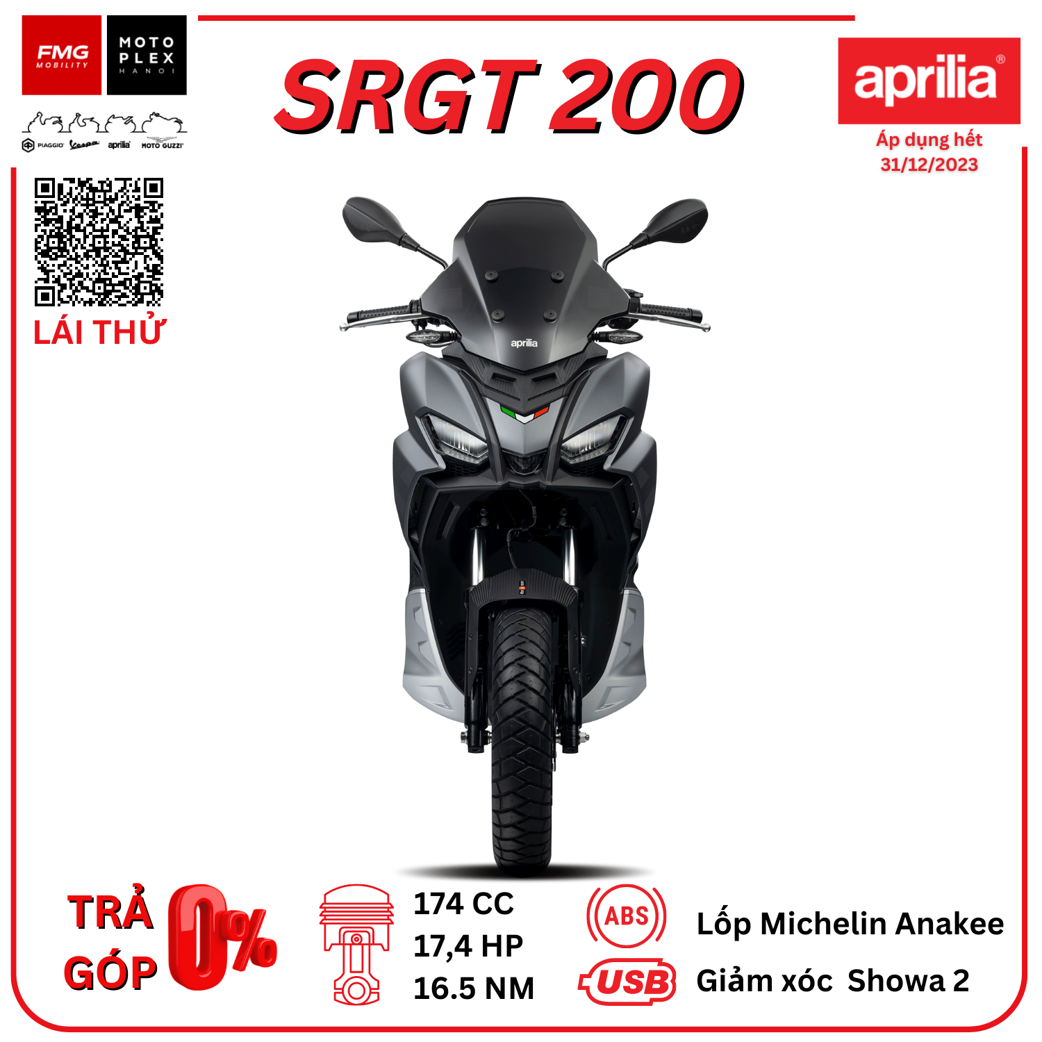 Aprilia SR GT 200 – xe tay ga đa địa hình sản xuất tại Piaggio Việt Nam, được bán ra với hai phiên bản, gồm tiêu chuẩn (đen, xám, xanh) giá 97 triệu và bản Sport (vàng đồng, xám, đỏ nhám) giá 99,5 triệu đồng. Đây là mẫu xe ga được xuất đi tất cả các thị trường trên thế giới.
