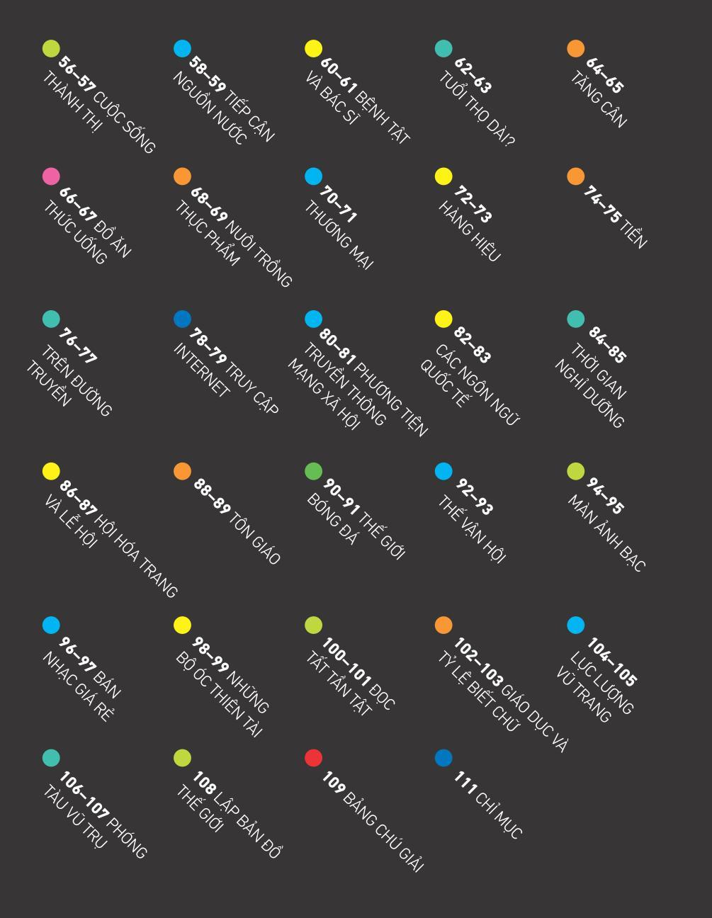 Cuốn sách này bao gồm 50 tấm bản đồ, biểu diễn các số liệu và thông tin độc đáo về hầu như mọi thứ bạn muốn biết về thế giới của chúng ta. Từ những