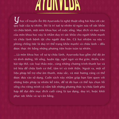 Là môn khoa học về sự tự chữa lành, Ayurveda bao gồm chế độ ăn và dinh dưỡng, lối sống, việc luyện tập, nghỉ ngơi và thư giãn, thiền định, các bài tập thở, các loại thảo mộc, cùng những chương trình thanh lọc và trẻ hóa để chữa lành cơ thể, tâm trí và tinh thần. Ngoài ra, một số liệu pháp bổ trợ như âm thanh, màu sắc và mùi hương cũng có thể được đưa vào sử dụng. Cuốn sách này nhằm giúp bạn làm quen với những biện pháp tự nhiên kể trên, để từ đó bạn có thể lựa chọn lối sống cho riêng mình và nắm bắt những phương thức tự chữa lành phù hợp nhằm đạt đến mục đích cuối cùng là tạo dựng, duy trì hoặc khôi phục sức khỏe và sự cân bằng.