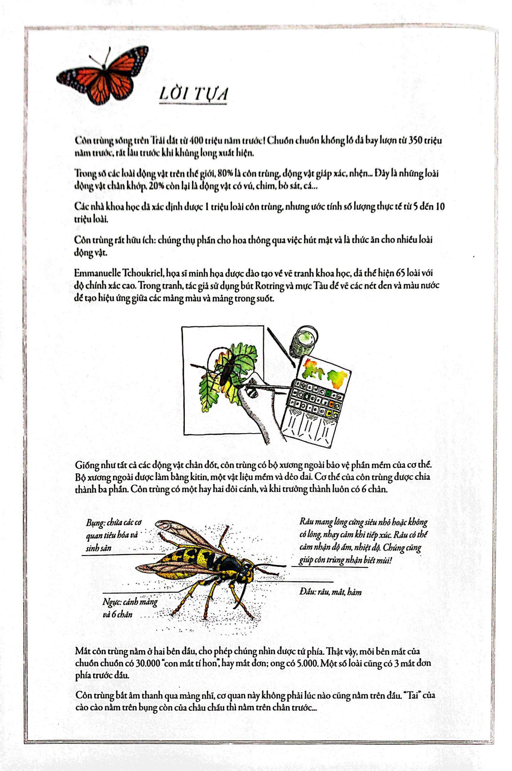 Inventaire illustré des insectes - Thế giới côn trùng bằng tranh Cuốn Thế giới côn trùng bằng tranh này mở ra trước mắt bạn một thế giới đầy màu sắc: thế giới tí hon của các loài côn trùng. Trong số 70 loài được trình bày, có sự xuất hiện của các loài được biết đến rộng rãi (muỗi, ong, bọ rùa) và cả những loài bí ẩn hơn như bọ sừng hươu, bướm mắt rắn hay như bọ ngựa cầu nguyện. Chúng trông như thế nào? Thông tin Virginie Aladjidi đưa ra rất đơn giản và đầy đủ về thế giới tí hon của các loài côn trùng với các hoạt động đa dạng khi nhảy, cắn, đốt, ngụy Nét vẽ của Emmanuelle Tchoukriel đưa ra hình ảnh cận cảnh tuyệt vời mà ta khó lòng quan sát trong tự nhiên.