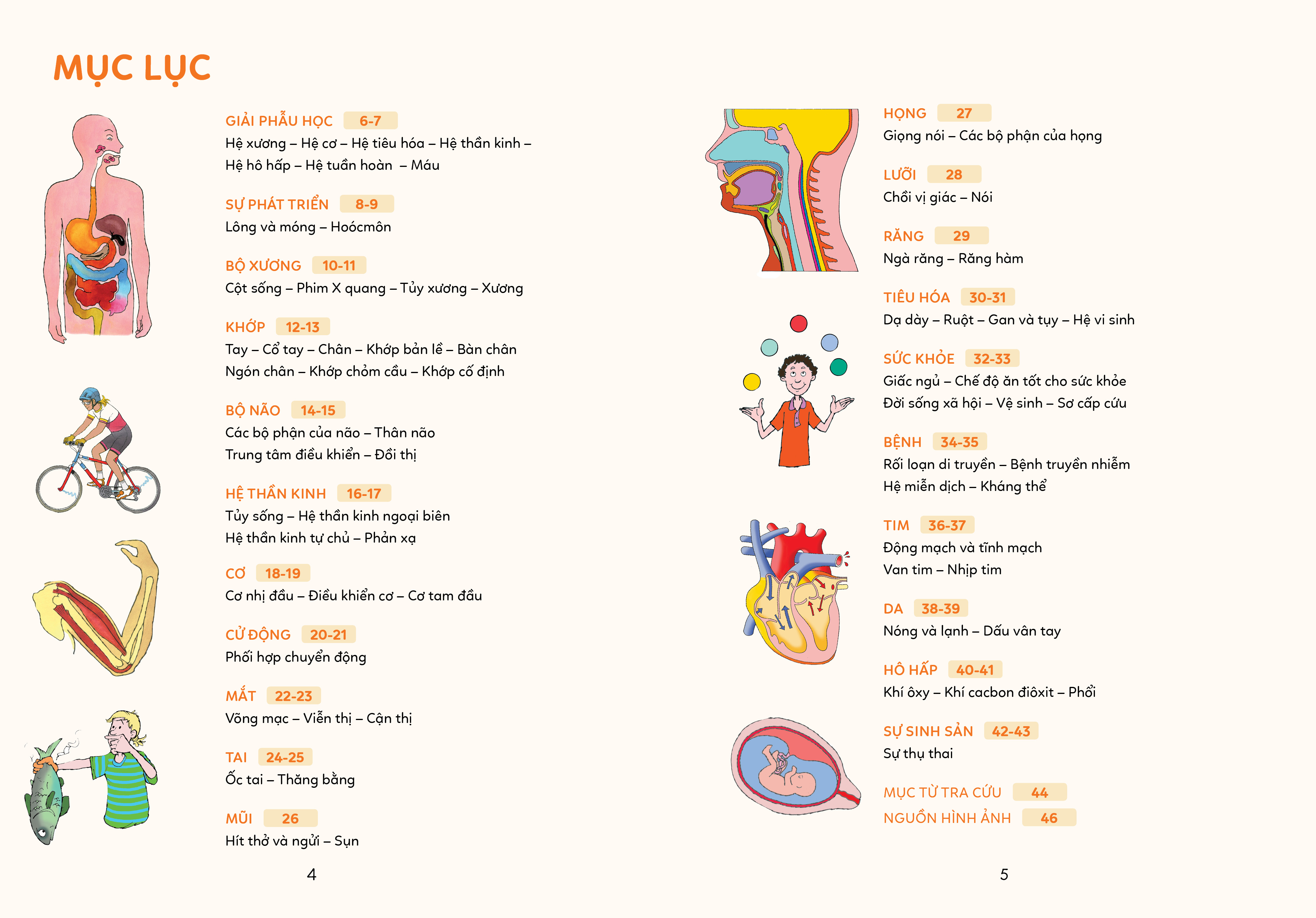 Điều gì diễn ra bên trong các cơ quan khiến cơ thể chúng ta hoạt động, phát triển, duy trì sự sống và khỏe mạnh? Cuốn sách này giúp khám phá mọi bộ phận, cơ quan, cùng cách thức hoạt động của chúng bao gồm: Giải phẫu học – Hệ xương – Hệ cơ – Hệ tiêu hóa – Hệ thần kinh – Hệ hô hấp – Hệ tuần hoàn – Máu – Sự phát triển – Bộ xương – Bộ não – Hệ thần kinh – Cơ – Mắt – Tai – Mũi – Họng – Lưỡi – Răng – Hệ tiêu hóa – Chế độ ăn tốt cho sức khỏe – Đời sống xã hội – Vệ sinh – Sơ cấp cứu – Bệnh – Hệ miễn dịch – Kháng thể – Tim – Động mạch và tĩnh mạch – Da – Hô hấp – Sự sinh sản – Sự thụ thai...