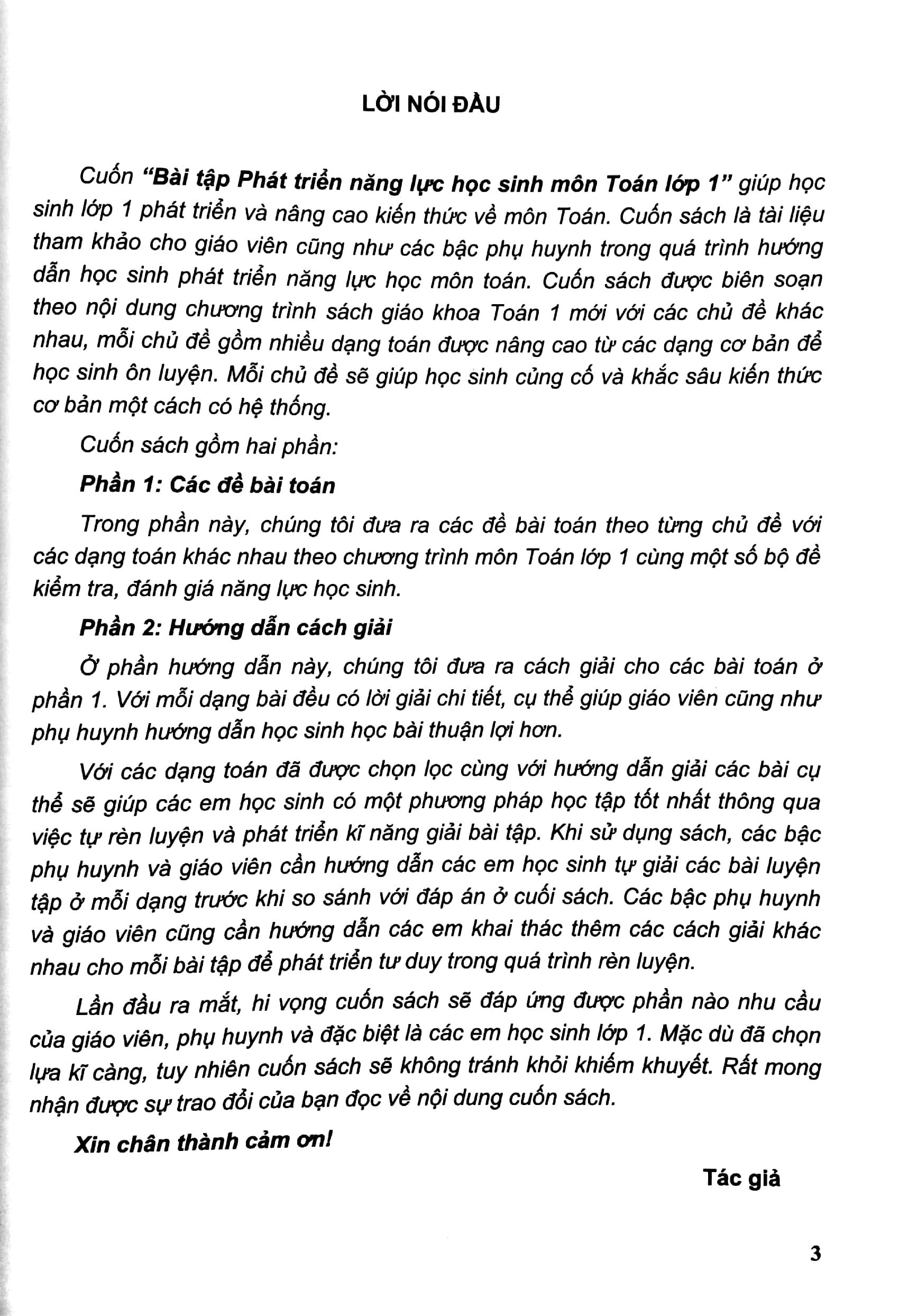 Lần đầu ra mắt, hi vọng cuốn sách sẽ đáp ứng được phần nào nhu cầu của giáo viên, phụ huynh và đặc biệt là các em học sinh lớp 1. Mặc dù đã chọn lựa kĩ càng, tuy nhiên cuốn sách sẽ không tránh khỏi khiếm khuyết. Rất mong nhận được sự trao đổi của bạn đọc về nội dung cuốn sách. Xin chân thành cảm ơn!