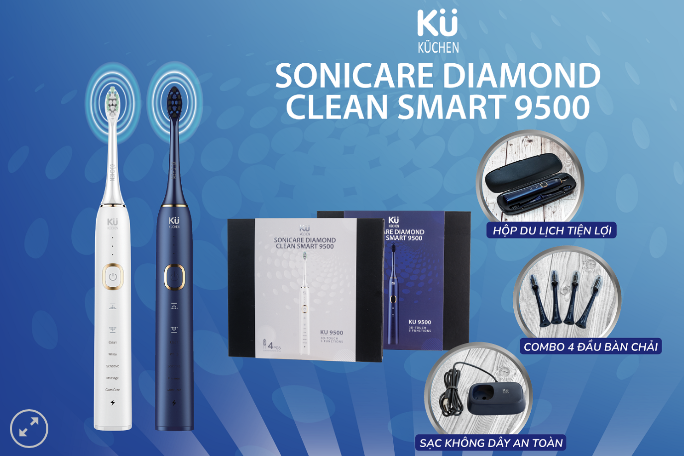 Bàn chải đánh răng Sóng âm KU DIAMOND CLEAN 9500, sử dụng công nghệ sóng âm Sonic nhẹ nhàng làm sạch răng tối ưu được các chuyên gia nha sĩ hàng đầu khuyên dùng, đồng thời trang bị nhiều tính năng mới hiện đại đánh bay các mảng bám cứng đầu, giúp răng trắng sáng, hơi thở thơm mát, ngăn ngừa các bệnh về răng miệng hiệu quả hơn 10 lần so với các loại bàn chải thông thường.