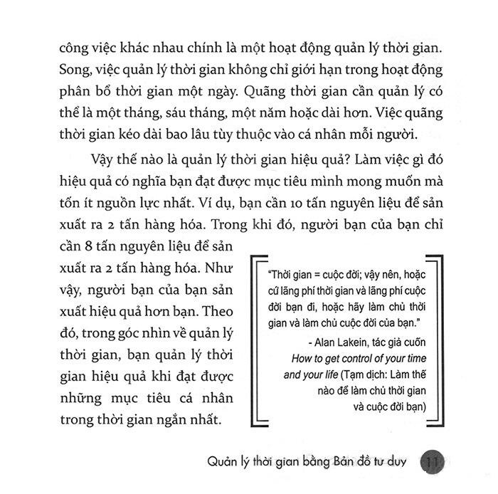 Cuốn sách Bản đồ tư duy trong quản lý thời gian sẽ giới thiệu cho bạn phương pháp quản lý thời gian hiệu quả nhất bằng cách ứng dụng bản đồ tư duy vào phạm trù này. Bạn sẽ biết cách sử dụng thời gian, đặc biệt là thời gian rảnh rỗi một cách tốt nhất cho sự phát triển của bản thân, mà vẫn giữ được sự cân bằng trong cuộc sống, giữa làm việc và thư giãn, đặc biệt là trị được căn bệnh lười biếng, không có mục tiêu của mình để trở thành người hạnh phúc hơn và thành công hơn trong cuộc sống.