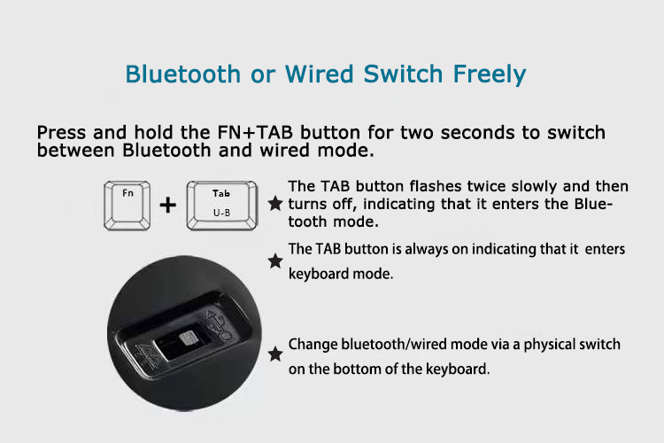 Features: USB wired/BT dual-mode connection, support multiple devices. It can connect wih three devices, easy to switch. 68 keys compact layout, gives the mouse more activity space, independent direction keys make the game control more