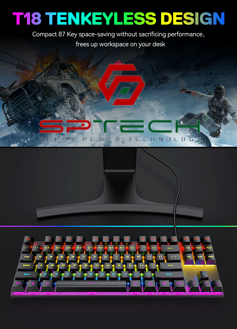 Thiết kế tiết kiệm không gian, layout full-size 87 phímT-Wolf T18 sở hữu thiết kế hiện đại, trẻ trung với tông màu đen chủ đạo, cùng hệ thống đèn LED RGB rực rỡ, tạo điểm nhấn cho góc chơi game của ...
