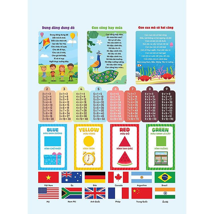 Mỗi bảng bao gồm hai trang. Trên mỗi bảng đều có một trang kiến thức chung, với nội dung giống nhau xoay quanh các kiến thức hữu ích cho trẻ như bảng cửu chương từ 2-9, hình dạng và màu sắc cơ bản bằng cả tiếng Anh&Việt, 3 bài đồng dao tiếng Việt và 12 quốc kì. Trên mặt còn lại là bảng âm thanh theo từng chủ đề: