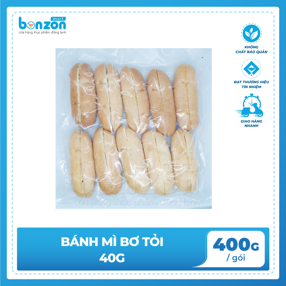 Với sản phẩm tươi sống, trọng lượng thực tế có thể chênh lệch khoảng 10%. ĐỊNH LƯỢNG: 400g/gói (10 cái) THÀNH PHẦN: Bánh mì, bơ lạt, tỏi, gia vị MÔ TẢ SẢN PHẨM: Có thể ăn kèm với xúc xích, thịt nguội - Màu sắc: Bánh sau khi nướng sẽ có màu vàng bắt mắt đặc trưng của bơ và điểm màu xanh của rau mùi tây - Cấu trúc: Bên ngoài là bánh mì, phần ruột bánh mì được phết đều lớp bơ tỏi - Mùi vị: Bánh mì giòn rụm, thơm béo mùi bơ hòa quyện vị tỏi - Nước chấm ăn kèm: Tương cà, tương ớt, mayonnaise CÁCH CHẾ BIẾN: - Không cần rã đông, nướng ở nhiệt độ 200⁰C trong 4-5 phút BẢO QUẢN: - Trong ngăn đông tủ -15 đến -18°C - Không đông lại sau khi rã đông - Sau khi rã đông cắt bao bì giữ trong tủ mát từ 0°C đến 5°C. Bảo quản được 3 ngày