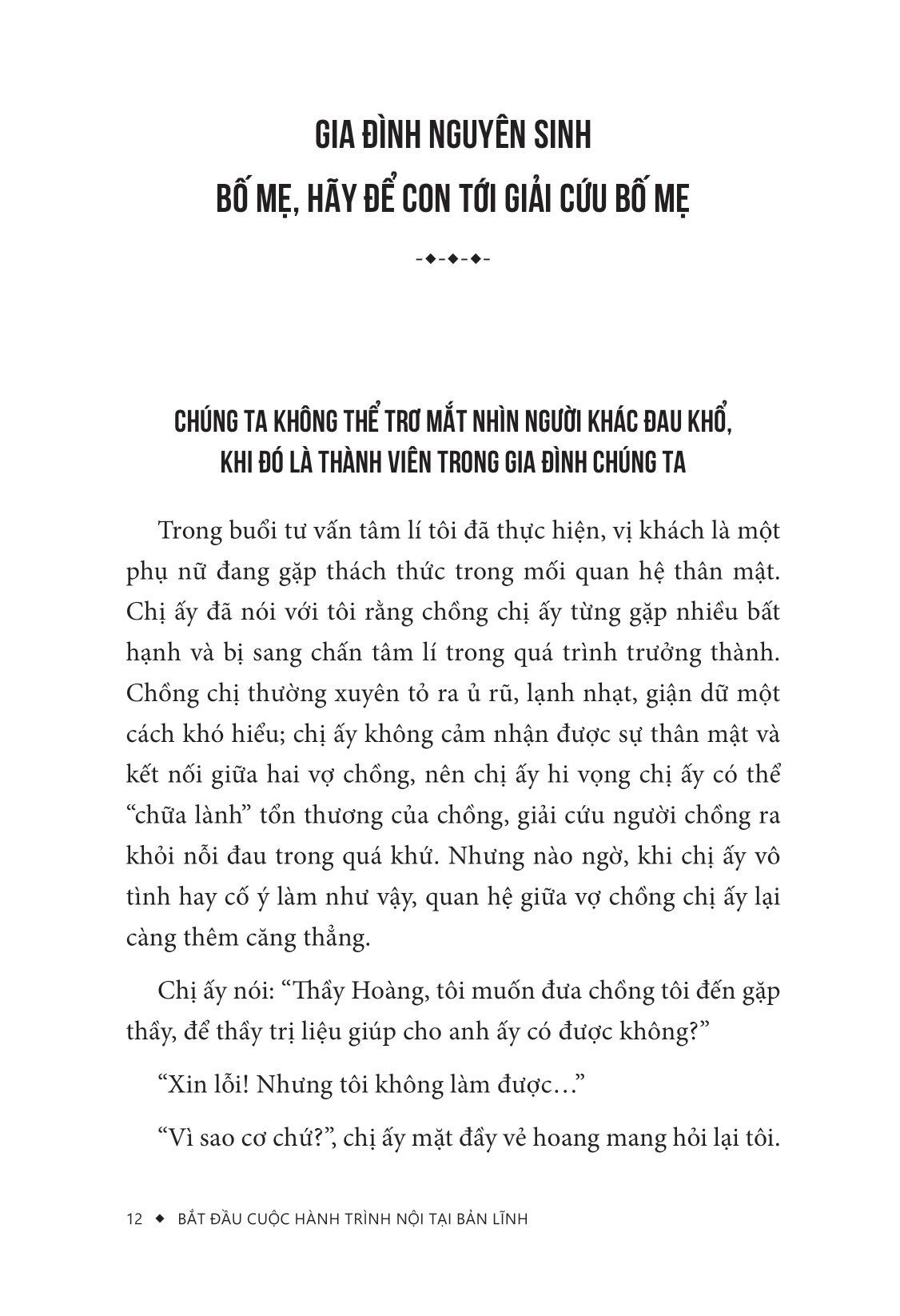 Bắt Đầu Cuộc Hành Trình Nội Tại Bản Lĩnh Nếu bạn có thể chữa lành bản ngã tổn thương bên trong m.ình thì đã là một thành tựu rất lớn rồi, nhưng đừng quên thiên phú trời ban cho bạn vẫn còn rộng mở tiềm năng nữa. Trong cuốn sách này, tác giả Hoàng Sĩ Minh sẽ dẫn dắt bạn các bước để làm chủ cuộc hành trình bản lĩnh của nội tại: