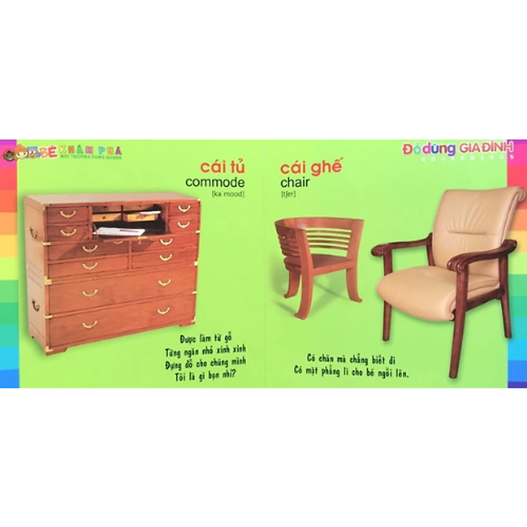 Mỗi trang sách có hình ảnh đi kèm, tên bằng tiếng Việt và tiếng Anh, có hướng dẫn phát âm và bài thơ ngắn đi kèm dễ đọc, dễ thuộc.