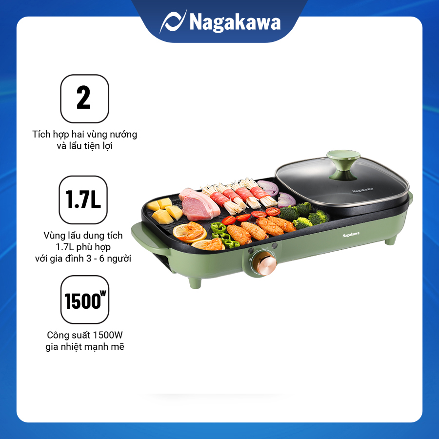 Bếp lẩu nướng điện đa năng Nagakawa NAG3104 là sự kết hợp tiện lợi của bếp nướng và nồi lẩu, với tổng công suất 1500W mạnh mẽ, nhanh chóng kích hoạt đồng thời cả 2 vùng nướng và lẩu một cách hiệu quả, đáp ứng cùng lúc nhu cầu đa dạng cho 3-6 người,mang đến trải nghiệm hài lòng cho các bữa tiệc tại gia.