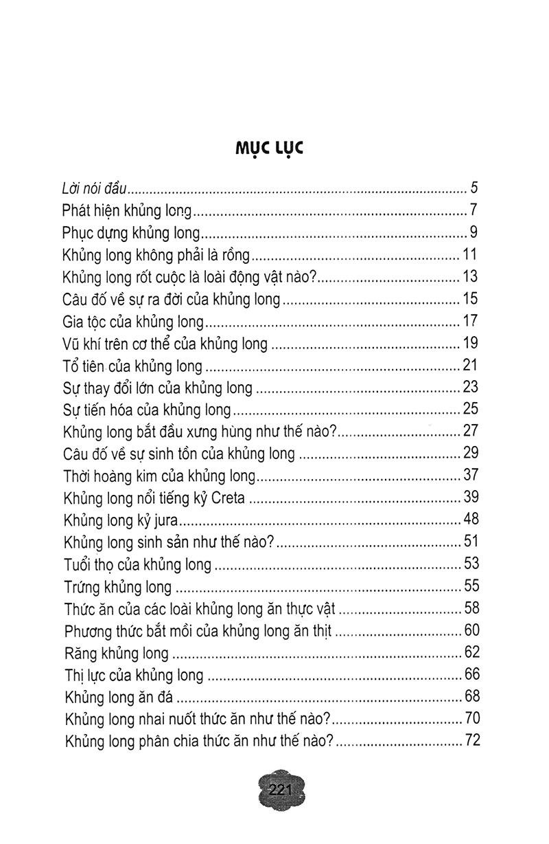 “Bí ẩn thế giới khủng long và những điều kỳ thú” là tài liệu giúp bạn đọc yêu thích khoa học tìm hiểu về loài động vật tiền sử này. Nội dung sách đi từ nguồn gốc tìm ra hóa thạch khủng long, sau đó các nhà khoa học đã tưởng tượng, phục chế ra hình dạng khủng long. Người đọc sẽ được lên cỗ máy thời gian, quay trở về thời tiền sử để tìm hiểu những chủng đa dạng của khủng long, tập tính sinh trưởng, tìm kiếm thức ăn, sống chung với đồng loại và sinh đẻ...