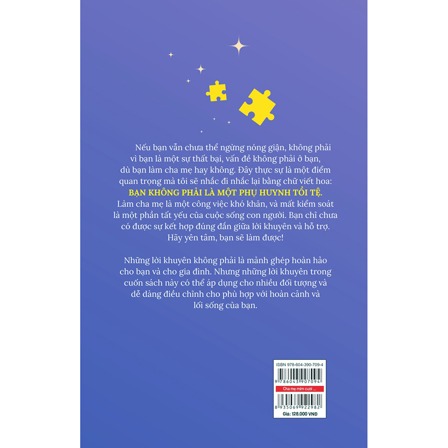 Cuốn sách chỉ ra những điểm kích hoạt phản ứng thiếu kiểm soát của cha mẹ đồng thời chỉ ra các phương pháp để cha mẹ bình tĩnh hơn, thư giãn hơn và cân bằng hơn trong khi giao tiếp và nuôi dạy con. Những lời khuyên không phải là mảnh ghép hoàn hảo cho bạn và cho gia đình. Nhưng những lời khuyên trong cuốn sách này có thể áp dụng cho nhiều đối tượng và dễ dàng điều chỉnh cho phù hợp với hoàn cảnh và lối sống của bạn.