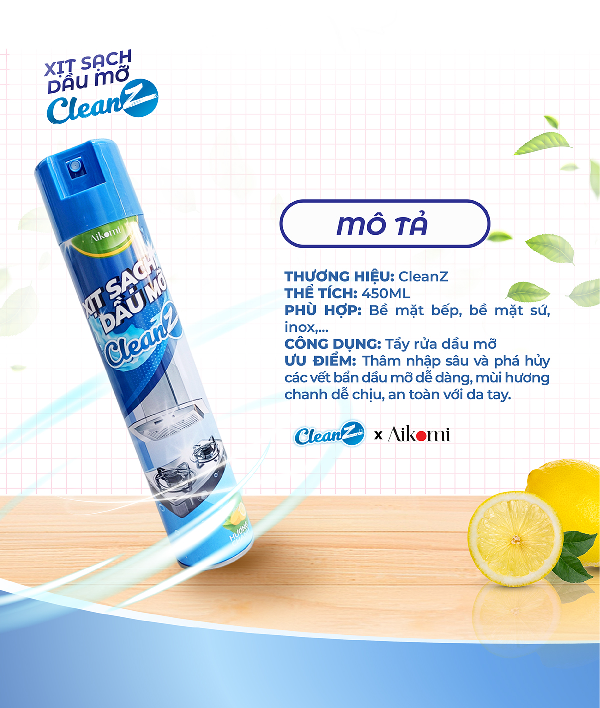 ● Xịt sạch dầu mỡ CleanZ là sản phẩm thế hệ mới chuyên dùng làm sạch dầu mỡ trên màng lọc máy hút mùi, bếp ga, bếp từ, tường gạch ốp lát, thiết bị gia đình,