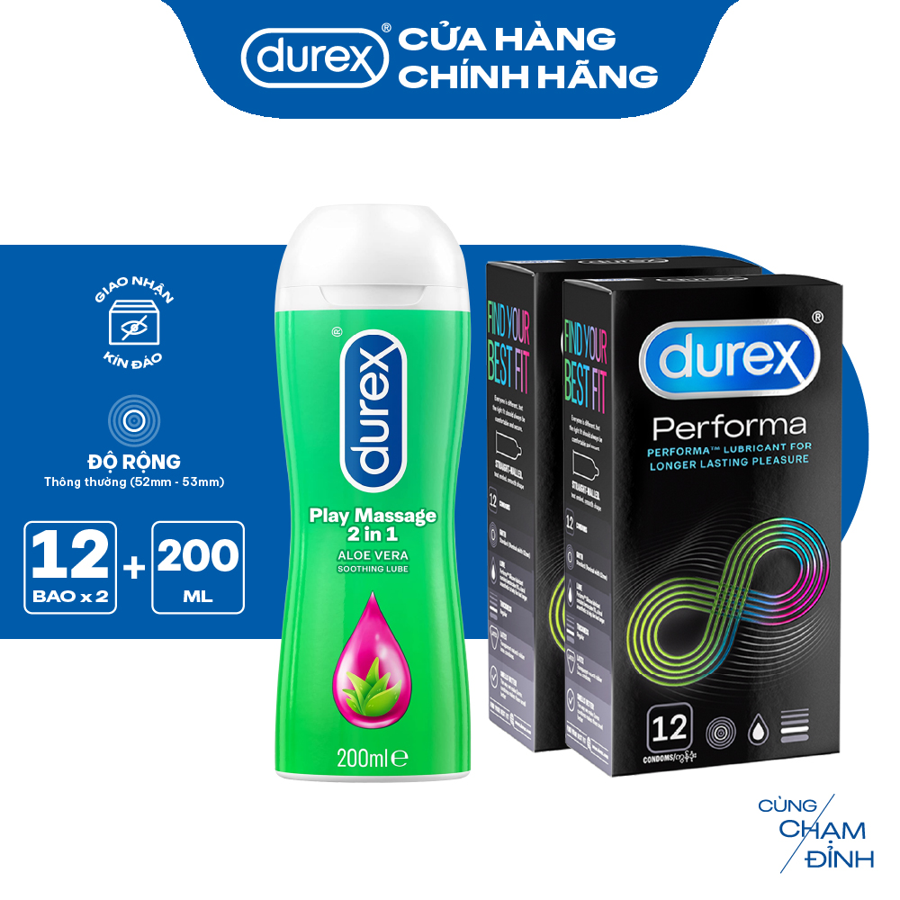 ✨Bộ 2 hộp bao cao su Durex Performa kéo dài thời gian (size 52mm, 12 bao/hộp) và 1 chai gel bôi trơn Durex Massage 2n1 200ml