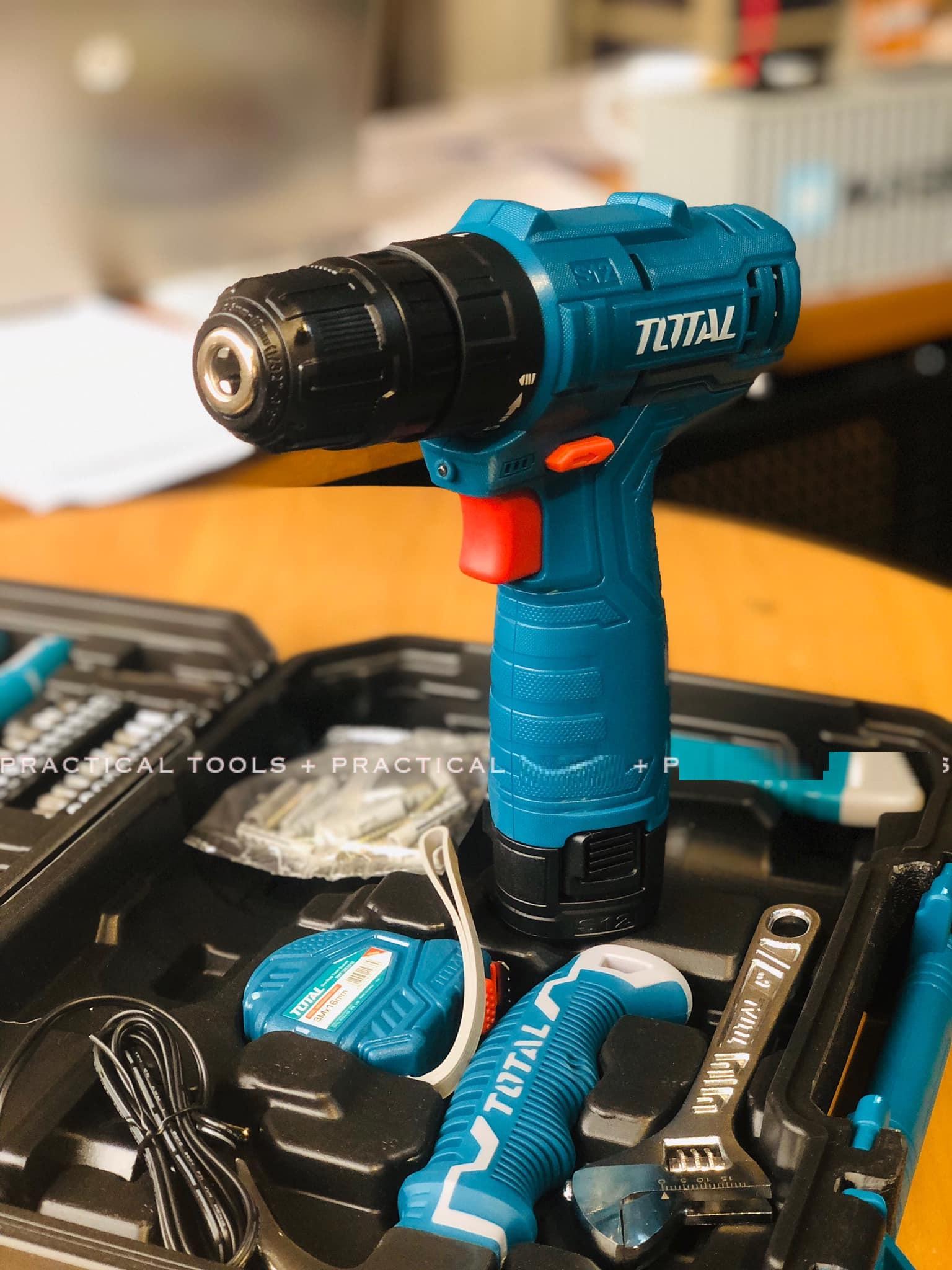 Thông số kĩ thuật -Mã sản phẩm: THKTHP10812 -Nhà sản xuất: Total -Xuất xứ: Trung Quốc -Bộ 81 món gồm: 1 máy khoan pin Lithium-Ion 12V/ 1.5Ah -model: TDLI12415. -Kèm 1 pin 1.5Ah và 1 sạc, -Điện thế sạc: 220V-240V~50/60Hz, -1 mũi từ, 1 búa nhổ đinh 8OZ, 1 tua vit SL5.5x100, 1 tua vít PH1x100, 1 kềm răng 7 inch, 1 mỏ lết 6 inch, , 1 bút thử điện (Điện áp thử nghiệm 100-500VAC), 1 thước kéo 3M, 1 dao rọc 9mm, 5 Mũi khoan xoắn 2,3,4,5,6mm, 4 -Mũi khoan gỗ: 4,5,6,8mm.20 tua vít SL3, SL4, SL5, SL6, PH0, PH1, PH2, PH3, PZ0, PZ1, PZ2, PZ3, T10, T15, T20, T30, H3, H4, H5, H6. 20 ốc(10cST3.5,10cST4), 20 bake nhựa (10c6mm , 100c5mm). -Bảo hành: 6 tháng