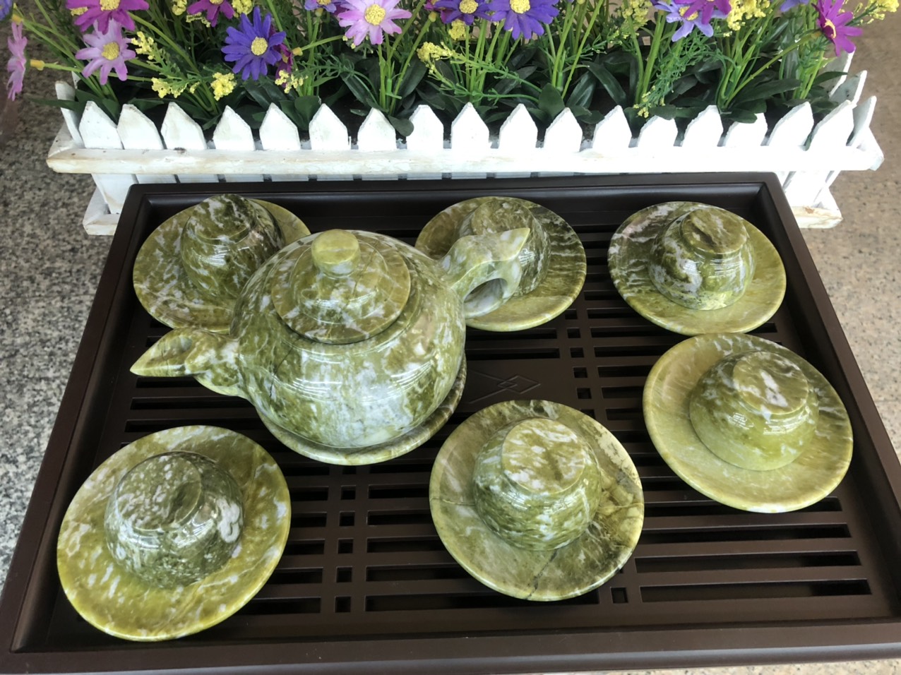 Chất liệu: Đá ngọc Serpentine Bộ sản phẩm gồm: 7 dĩa, 6 ly và 1 ấm trà Dùng để uống trà hoặc làm quà biếu tặ