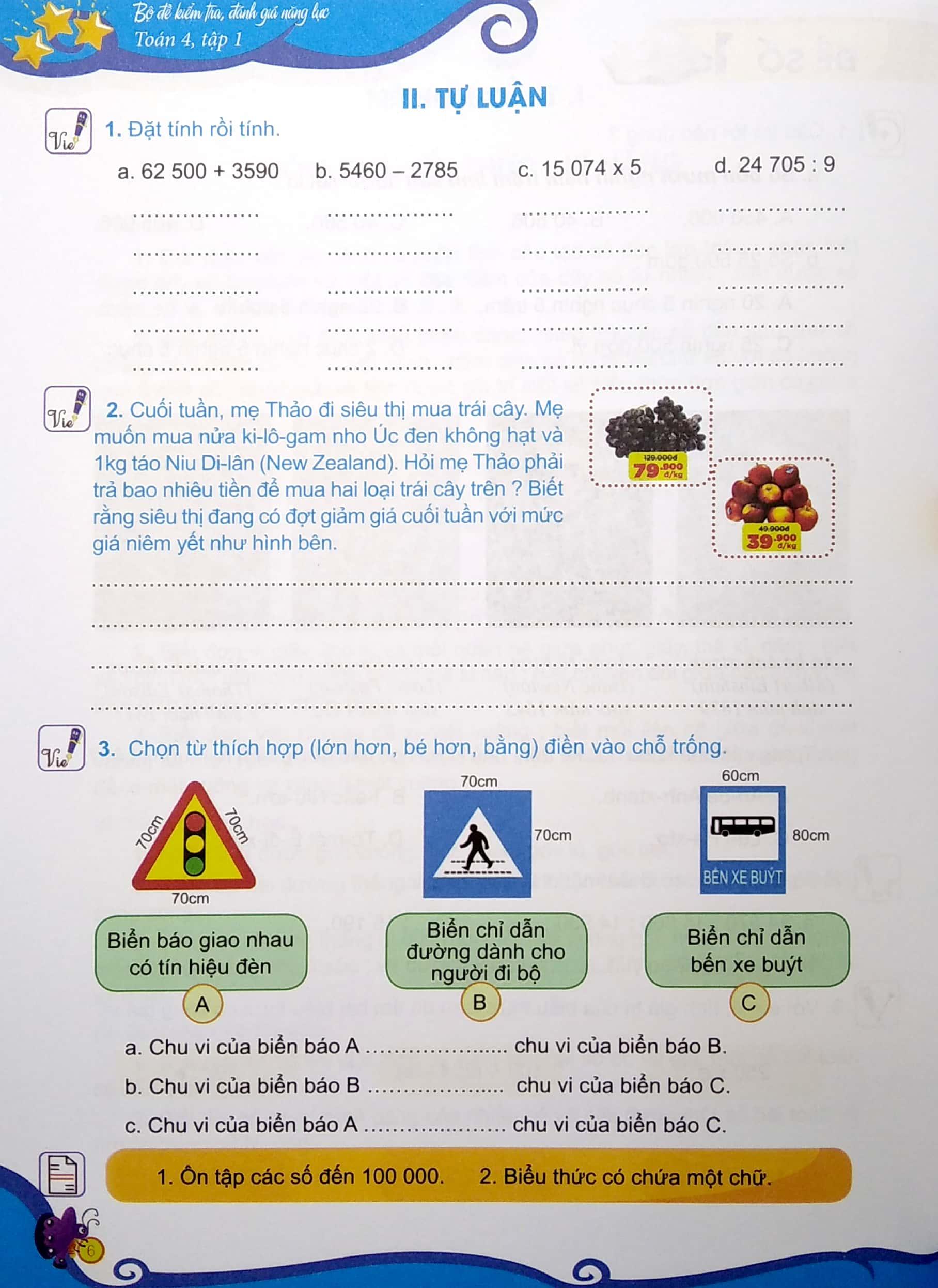 Sách được in màu, trình bày trên giấy khổ rộng, kèm thêm hình ảnh minh họa nhằm tảng hứng thú và sự chú ý của các em trong quá trình giải toán. Các bài tập đều dành chỗ trống để các em thế hiện bài làm của mình. Cuối mỗi tập sách có phần “Hướng dẫn giải” giúp các em có thể tự học và tự kiểm tra kêt quả, đồng thời cũng giúp phụ huynh hướng dẫn, gỉải thích thêm cho các em.