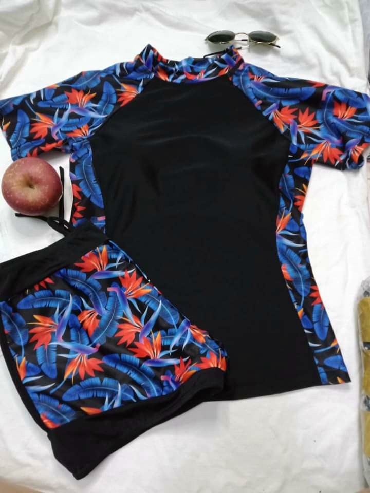 - Mẫu đồ bơi mới nhất cho các bạn nữ thích sự trẻ trung kín đáo mà vẫn thu hút khi đi biển, đi bơi. - Áo dáng ngắn tay phối hoạ tiết trẻ khoẻ,