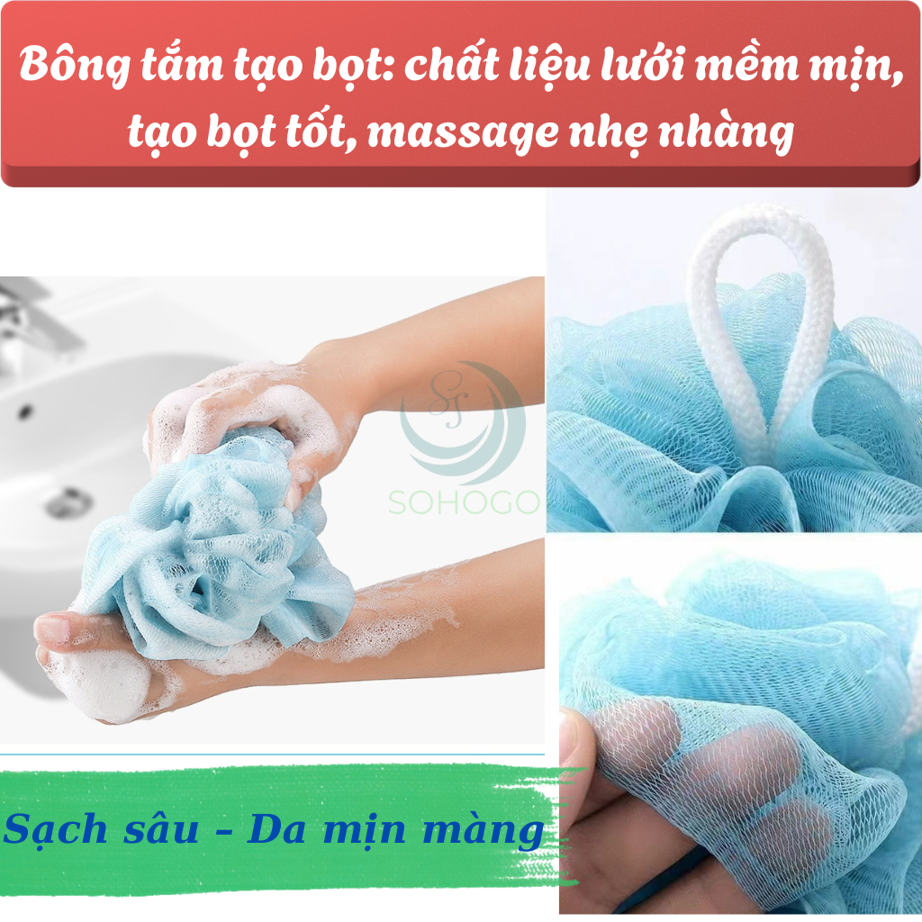 - Bông tắm tạo bọt: chất liệu lưới mềm mịn, tạo bọt tốt, massage nhẹ nhàng. Ưu điểm nổi bật: