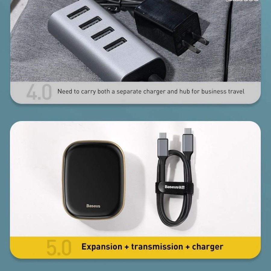 • Tổng công suất tối đa HUB: 60W Chú ý*: Bạn có thể sử dụng bộ HUB mà không cần cấp nguồn cho hub (220V), HUB sẽ lấy nguồn điện từ laptop/máy tính của bạn thông qua cổng kết nối Type C . Tuy nhiên khả năng sử dụng và hiệu suất sẽ bị giảm hoặc thậm chí hub sẽ không hoạt động được khi bạn kết nối nhiều thiết bị cùng lúc và nguồn điện từ laptop/máy tính bạn quá yếu. Hình ảnh chi tiết Hub chuyển đổi đa năng tốc độ cao Baseus Type-C HUB Adapter AC Multifunctional Charger