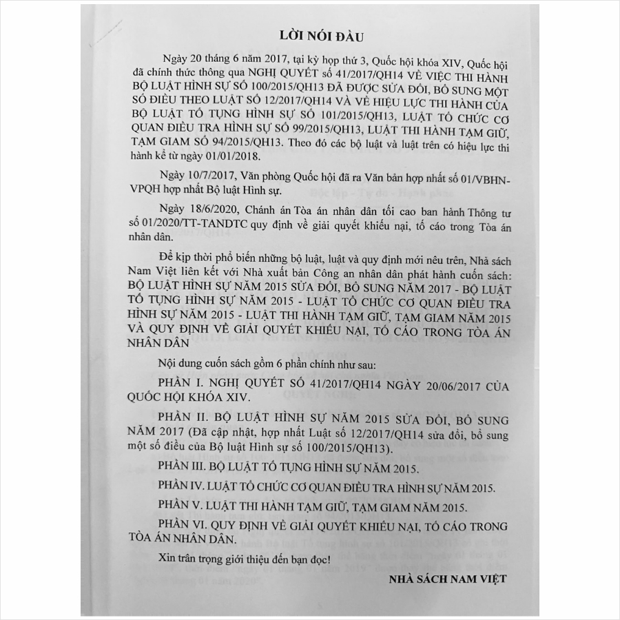 Nhà sách Nam Việt – Namvietbook xin trân trọng giới thiệu cuốn sách: Bộ Luật Hình Sự 2015 sửa đổi, bổ sung năm 2017 - Bộ Luật Tố Tụng Hình Sự 2015 - Luật Tổ Chức Cơ Quan Điều Tra Hình Sự - Luật Thi Hành Tạm Giữ, Tạm Giam Năm và Quy Định Về Giải Quyết Khiếu Nại, Tố Cáo Trong Tòa Án Nhân Dân Sách Bộ Luật Hình Sự 2015 sửa đổi, bổ sung năm 2017 - Bộ Luật Tố Tụng Hình Sự 2015 - Luật Tổ Chức Cơ Quan Điều Tra Hình Sự - Luật Thi Hành Tạm Giữ, Tạm Giam Năm và Quy Định Về Giải Quyết Khiếu Nại, Tố Cáo Trong Tòa Án Nhân Dân