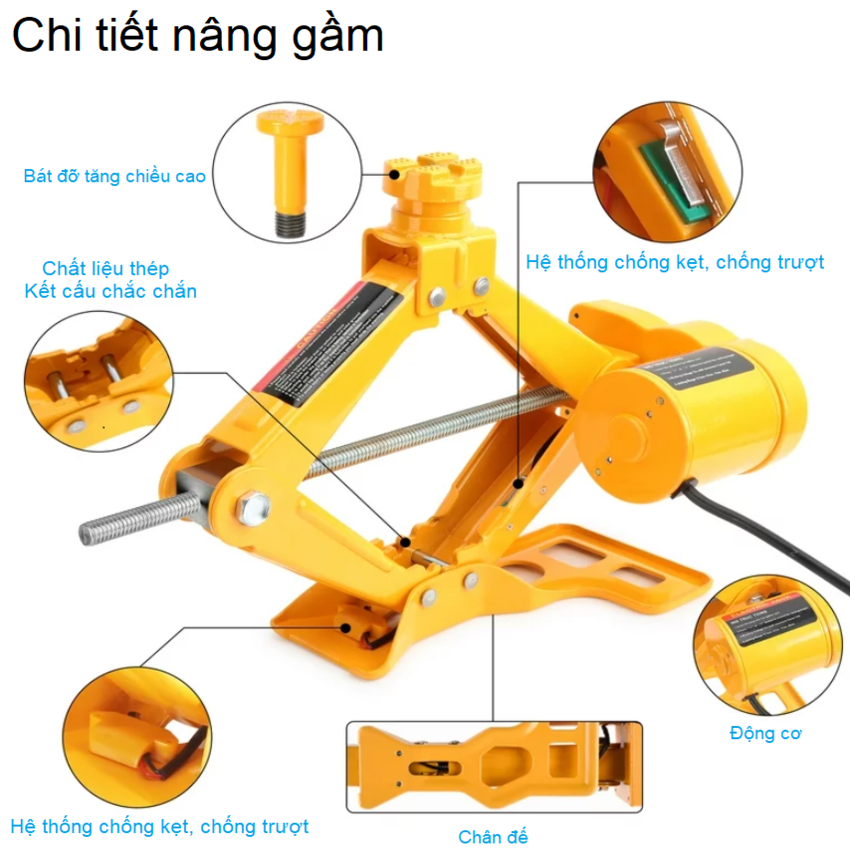 - Kích (con đội an toàn) với hành trình từ 12-35cm, 12-37 và 17-42cm, thời gian nâng 2-3 phút
