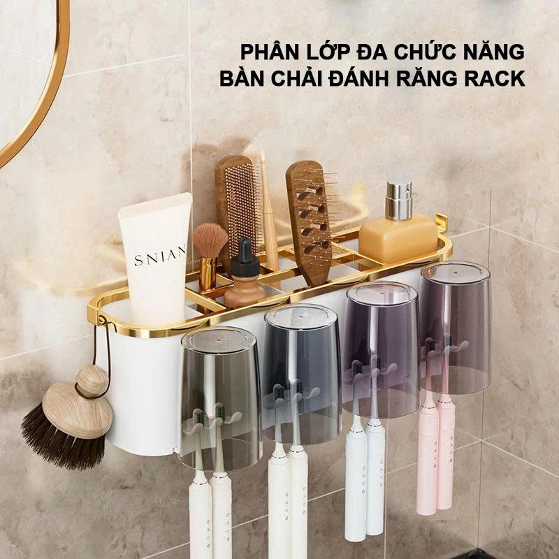 Thiết kế đa năng: Tích hợp kệ để bàn chải, kem đánh răng và 4 cốc súc miệng tiện dụng, phù hợp cho cả gia đình.