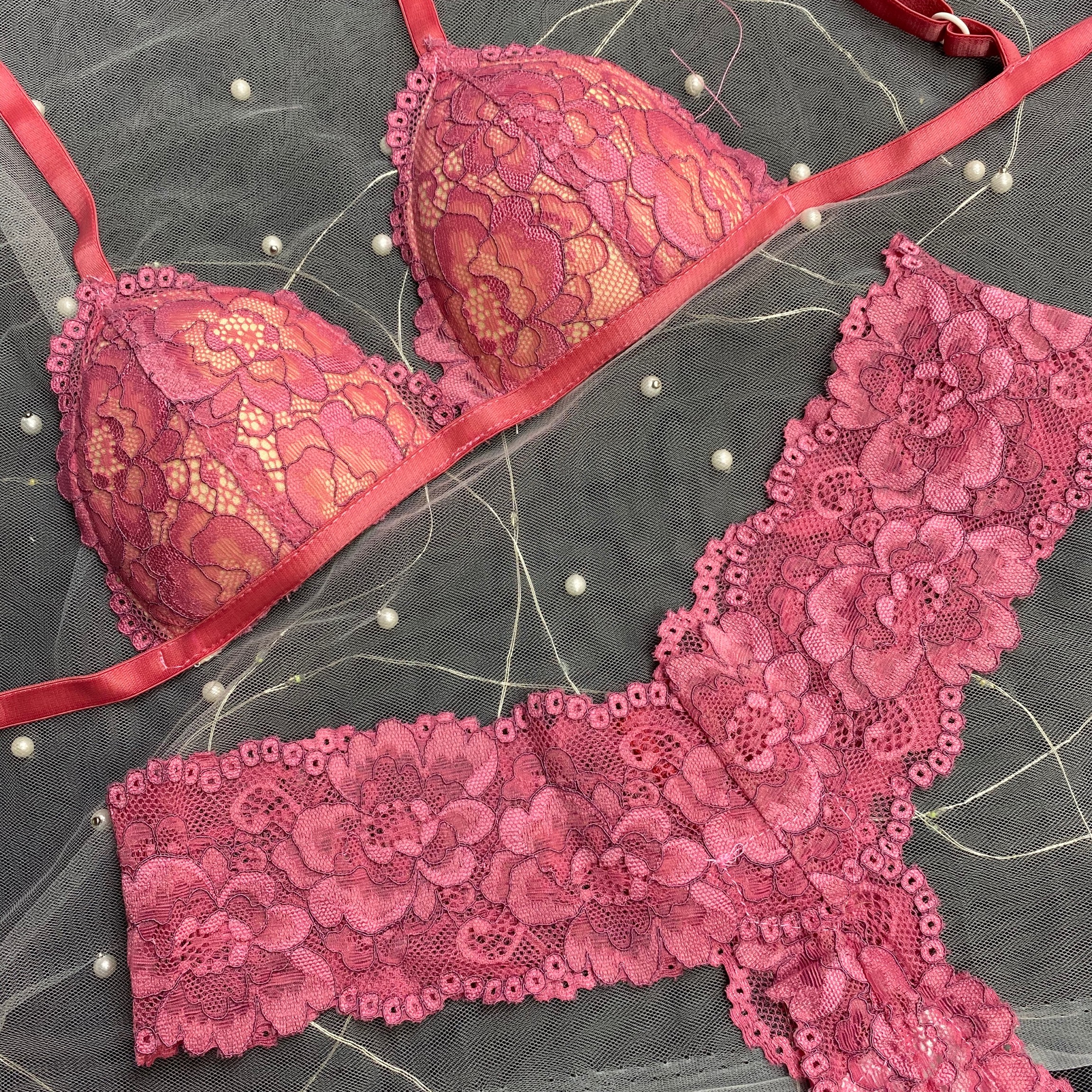 ✨Bộ Nội Y Thiết Kế Ren Cao Cấp Hồng San Hô Có Mút Quần Chữ Y
