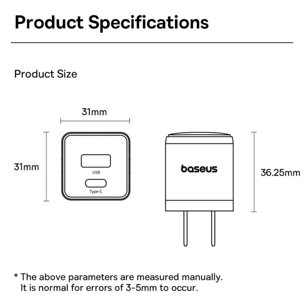 - Với kích thước siêu nhỏ gọn, bộ sạc Baseus Palm không chỉ giúp tiết kiệm không gian khi sử dụng mà còn cực kỳ thuận tiện để bỏ túi hoặc mang theo trong balo, túi xách. Vỏ ngoài được gia công tỉ mỉ, chắc chắn và đẹp mắt, phù hợp với phong cách tối giản hiện đại. Hình ảnh Bộ sạc nhanh nhỏ gọn 2 cổng Baseus Palm U + C 30W Kèm cáp C to C 60w dài 1M - Hàng chính hãng