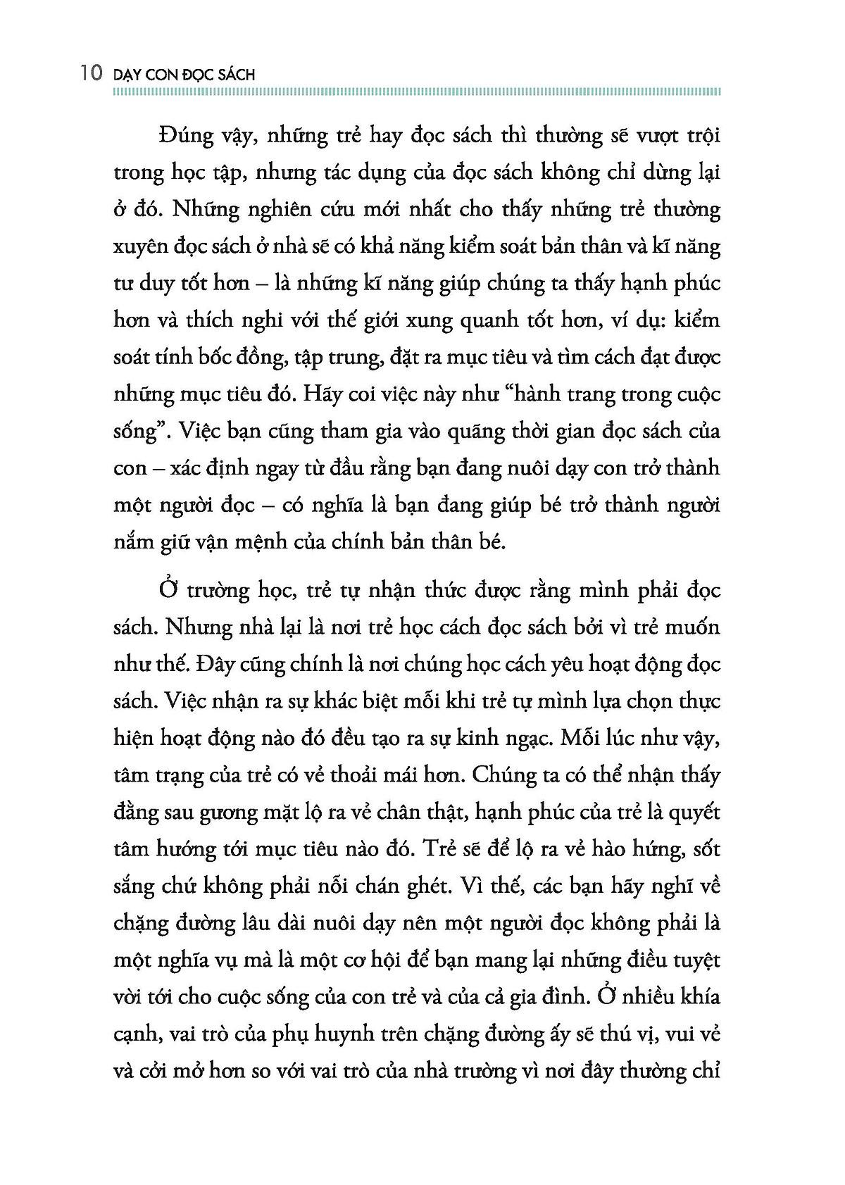 Cuốn Dạy con đọc sách kết hợp những lời khuyên dễ hiểu, thực tế, cùng với niềm cảm hứng, sự dí dỏm, những bí quyết thú vị và danh sách đọc được chọn lọc kĩ lưỡng bởi hai biên tập viên chuyên mục đánh giá sách hàng đầu của tờ New York Times, Pamela Paul & Maria Russo. Cuốn sách sẽ chỉ cho bạn cách tạo sự thích thú và niềm vui quên thời gian cho con trẻ từ việc đọc sách.