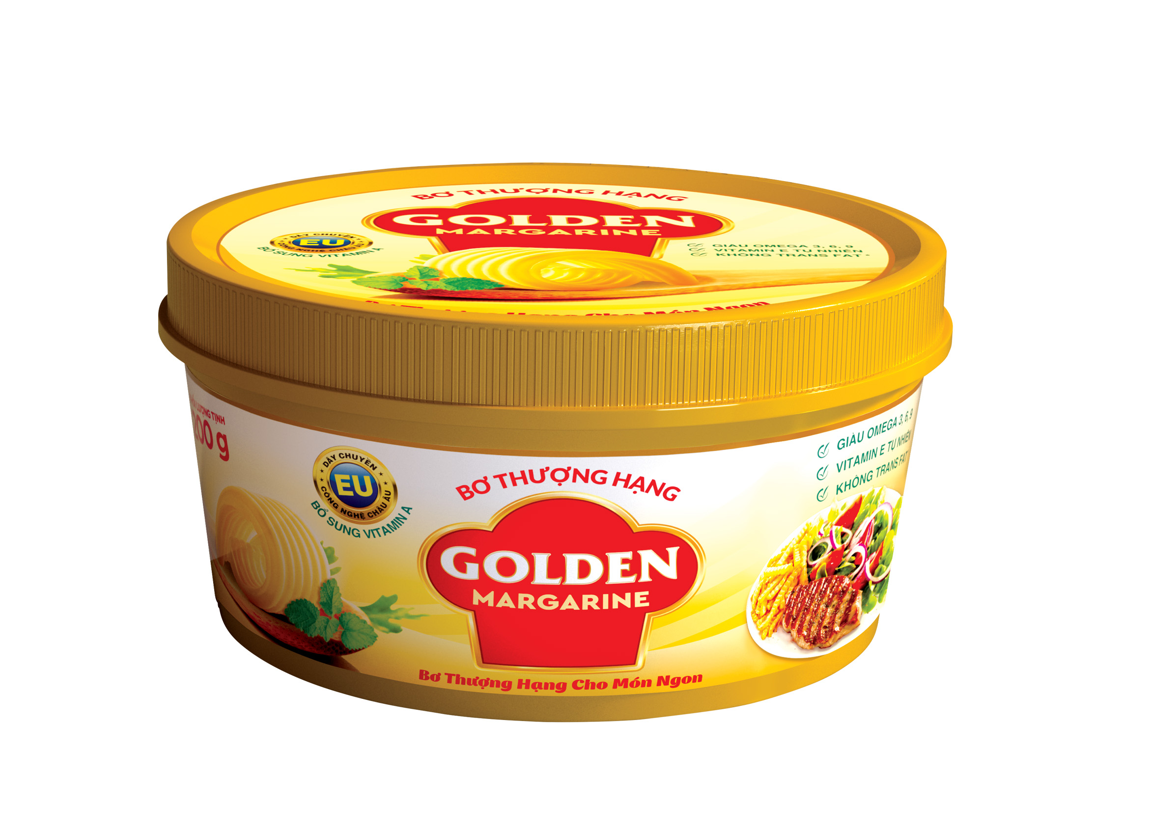 BƠ THƯỢNG HẠNG GOLDEN MARGARINE - BƠ THƯỢNG HẠNG CHO MÓN NGON Bơ thượng hạng Golden Magarine là một thực phẩm thơm ngon giúp tăng hương vị của món ăn và là một sản phẩm vô cùng quen thuộc với nhà nội trợ Việt. Bơ thượng hạng Golden Margarine được sản xuất tại Việt Nam theo dây chuyền công nghệ hiện đại từ Châu Âu, với thành phần được lựa chọn kỹ. Bơ thượng hạng Golden Margarine là bơ thực vật giàu Omega 3, 6, 9; Vitamin E tự nhiên; bổ sung Vitamin A; không chứa Transfat. Với hương bị thơm ngon đặc trưng, bơ thượng hạng Golden Margarine thường được sử dụng trong các công thức làm bánh ngọt, bánh mì, bánh quy, làm các món nướng, chiên xào, bắp rang bơ hoặc dùng ăn trực tiếp với bánh mì.