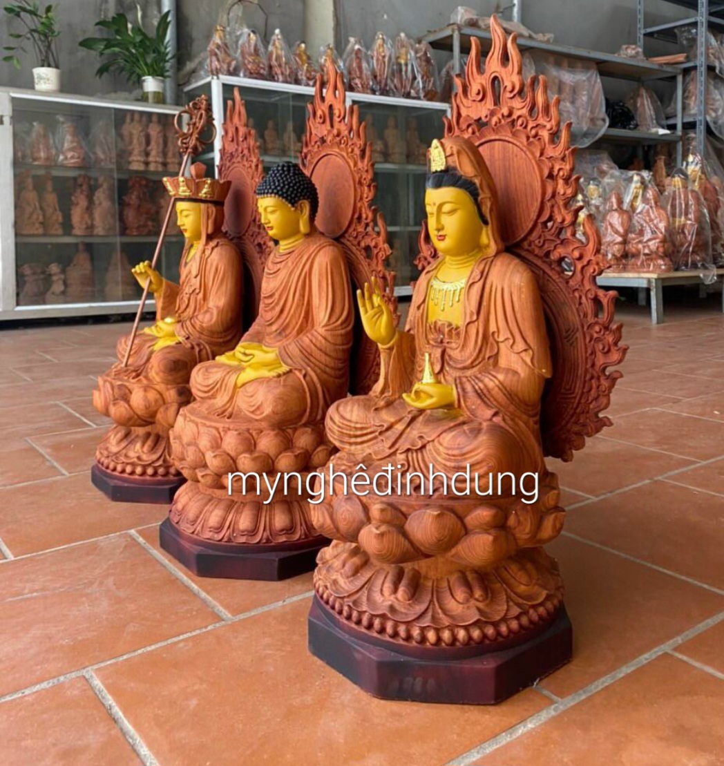Tượng Tây Phương Tam Thánh Tọa Đài Sen Gỗ Cẩm Vàng Cao 90cm (Mẫu Mới)