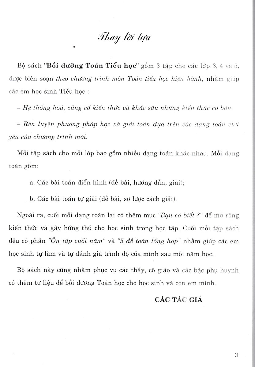 “Bồi dưỡng Toán Tiểu học”, gồm 3 tập cho các lớp 3, 4 và 5, được biên soạn theo chương trình môn Toán tiểu học hiện hành, nhằm giúp các em học sinh Tiểu học: