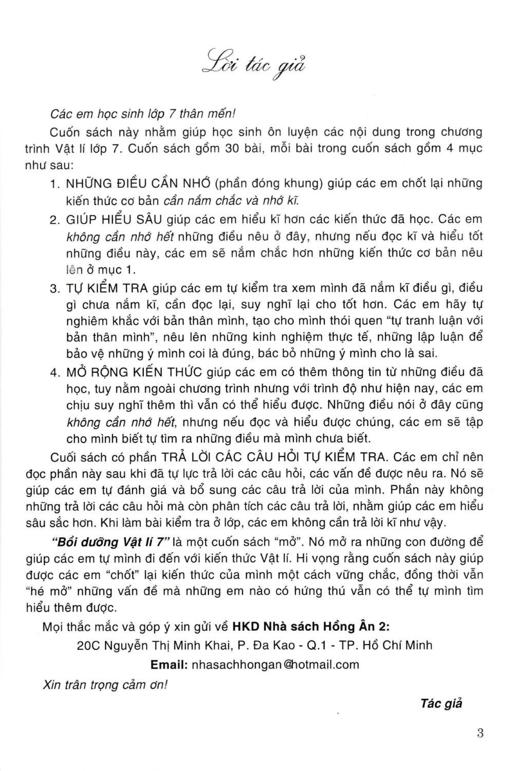 Bồi Dưỡng Vật Lí 7 là một cuốn sách “mở”. Nó mở ra những con đường để giúp các em tự mình đi đến với kiến thức Vật lí. Hi vọng rằng cuốn sách này giúp được các em “chốt” lại kiến thức của mình một cách vững chắc, đồng thời vẫn “hé mở” những vấn đề mà những em nào có hứng thú vẫn có thể tự mình tìm hiểu thêm được.