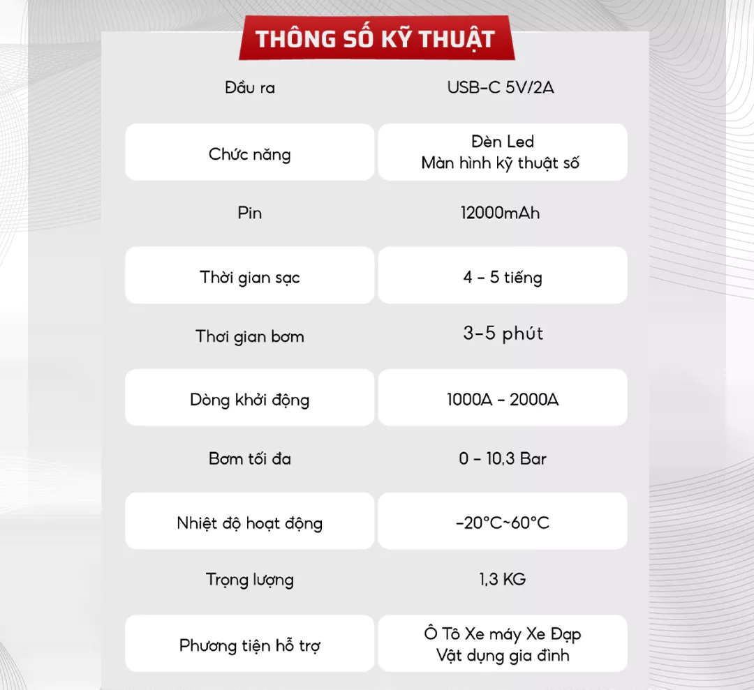 MÔ TẢ SẢN PHẨM     Bơm Lốp, Kích Bình Ô Tô, Xe Máy 4in1 GDV TS03 Pin LI-PO 12000mAh Kiêm Sạc Dự Phòng, Đèn Pin Chiếu Sáng - Hàng Chính Hãng Thiết kế nhỏ gọn nhưng cực kỳ đa năng, Bơm Lốp, Kích Bình Ô Tô, Xe Máy 4in1 GDV TS03 Pin LI-PO 12000mAh Kiêm Sạc Dự Phòng, Đèn Pin Chiếu Sáng - Hàng Chính Hãng là thiết bị không thể thiếu trên mọi hành trình. Với dung lượng pin 12.000mAh, máy vừa có thể kích bình ắc quy 12V, vừa đóng vai trò máy bơm lốp thông minh, sạc dự phòng và đèn pin siêu sáng. Thiết bị hỗ trợ kích bình nhanh cho xe máy, ô tô cá nhân, SUV... khi hết bình điện; giúp bơm lốp tiện lợi tại chỗ với chế độ cảm biến tự ngắt khi đủ áp suất. Cổng sạc USB cho phép sạc điện thoại mọi lúc, mọi nơi. Đặc biệt, đèn pin LED siêu sáng hỗ trợ khẩn cấp khi xe gặp sự cố vào ban đêm. TÍNH NĂNG NỔI BẬT: Kích bình 12V khỏe – Đề nổ nhanh ô tô, xe máy khi ắc quy yếu hoặc chết máy. Công nghệ kích X2 mạnh mẽ, có thể kích lên đến 8 lần/lần sạc. Bơm lốp thông minh – Dùng cho ô tô, xe máy, xe đạp, bóng thể thao... Tự ngắt khi đủ PSI. Pin 12.000mAh bền bỉ – Sạc nhanh, dùng lâu, hỗ trợ sạc dự phòng cho điện thoại, thiết bị điện tử. Đèn pin LED chiếu sáng – Đèn chiếu sáng 3 chế độ, hỗ trợ tốt vào ban đêm, cảnh báo khi khẩn cấp. Sạc dự phòng đa năng – Dòng điện ổn định, an toàn cho mọi thiết bị, hỗ trợ cổng USB & Type C, dòng ổn định 0.5A - 2A, sạc cho cả điện thoại, máy tính bảng…   THIẾT KẾ & ƯU ĐIỂM: Nhỏ gọn, dễ cất trong cốp xe. Màn hình LED hiển thị rõ ràng thông số. Hỗ trợ nhiều đầu chuyển van bơm. Chất liệu chắc chắn, chống sốc, chịu nhiệt tốt. BỘ SẢN PHẨM GỒM: Máy bơm/kích bình Dây kích bình Dây sạc Đầu chuyển bơm Túi đựng Hướng dẫn sử dụng