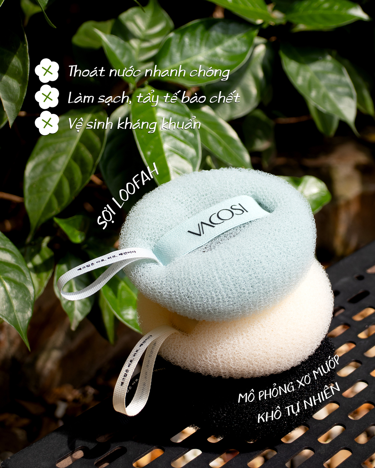 VACOSI Donut Bath Sponge - Bông Tắm Tẩy Tế Bào Và Massage Bông tắm Tẩy tế bào & Massage thư giãn VACOSI được thiết kế hình chiếc bánh Donut xinh xắn dễ thương. Chất liệu sợi Syntheltic Loofah- mô phỏng sợi sơ mướp tự nhiên, tạo bọt nhanh chóng và an toàn cho mọi loại da, kể cả da nhạy cảm. Tẩy tế bào chết hiệu quả: Loại bỏ lớp da sần sùi, kích thích quá trình tái tạo da, mang lại làn da mềm mịn và tươi trẻ. Làm sạch sâu lỗ chân lông: Bọt mịn từ bông tắm len lỏi vào từng lỗ chân lông, giúp loại bỏ bụi bẩn, dầu thừa và các tạp chất, mang lại làn da thông thoáng, sạch sẽ. Kích thích tuần hoàn máu: Quá trình massage nhẹ nhàng bằng bông tắm giúp tăng cường tuần hoàn máu, cho bạn làn da hồng hào và khỏe mạnh. Bông tắm có thiết kế cuộn Donut, đi kèm móc treo tiện dụng, có dây đeo kẹp tay co dãn chắc chắn dễ cầm nắm, tạo cảm giác thoải mái và tiện lợi khi sử dụng. Với 03 màu sắc sạch sẽ: trắng kem, đen và xám.   Hướng dẫn sử dụng: Làm ướt bông tắm. Cho một lượng nhỏ sữa tắm hoặc xà phòng lên bông tắm và tạo bọt. Massage nhẹ nhàng khắp cơ thể theo chuyển động tròn. Sau khi tắm xong, rửa sạch bông tắm và treo ở nơi thoáng mát.