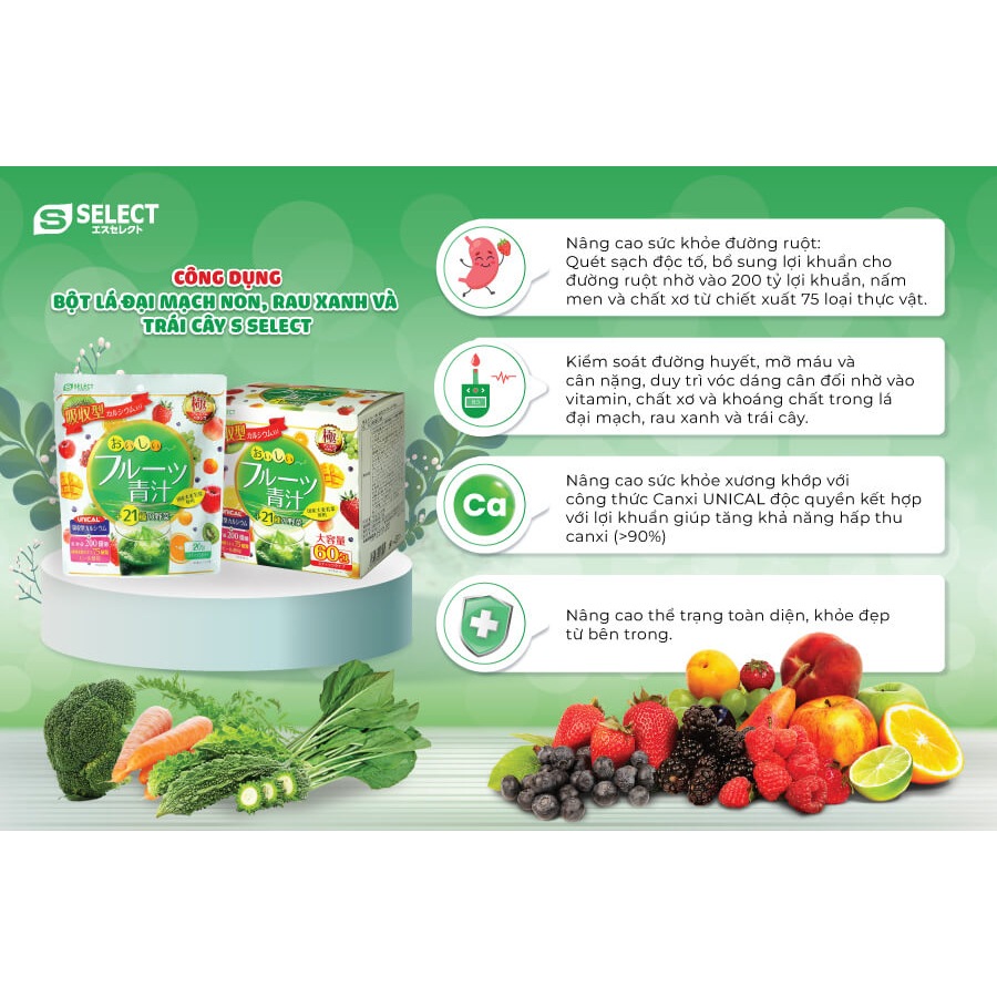 Bột lá đại mạch non, rau xanh và trái cây S Select Nhật Bản ( hộp 60 gói) giúp bổ sung chất xơ, vitamin từ 21 loại rau củ quả và chiết xuất của 75
