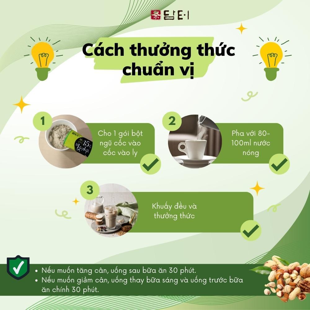 - Uống nóng: Cho 1 gói bột ngũ cốc Damtuh vào 80-100ml nước nóng, khuấy đều và thưởng thức.