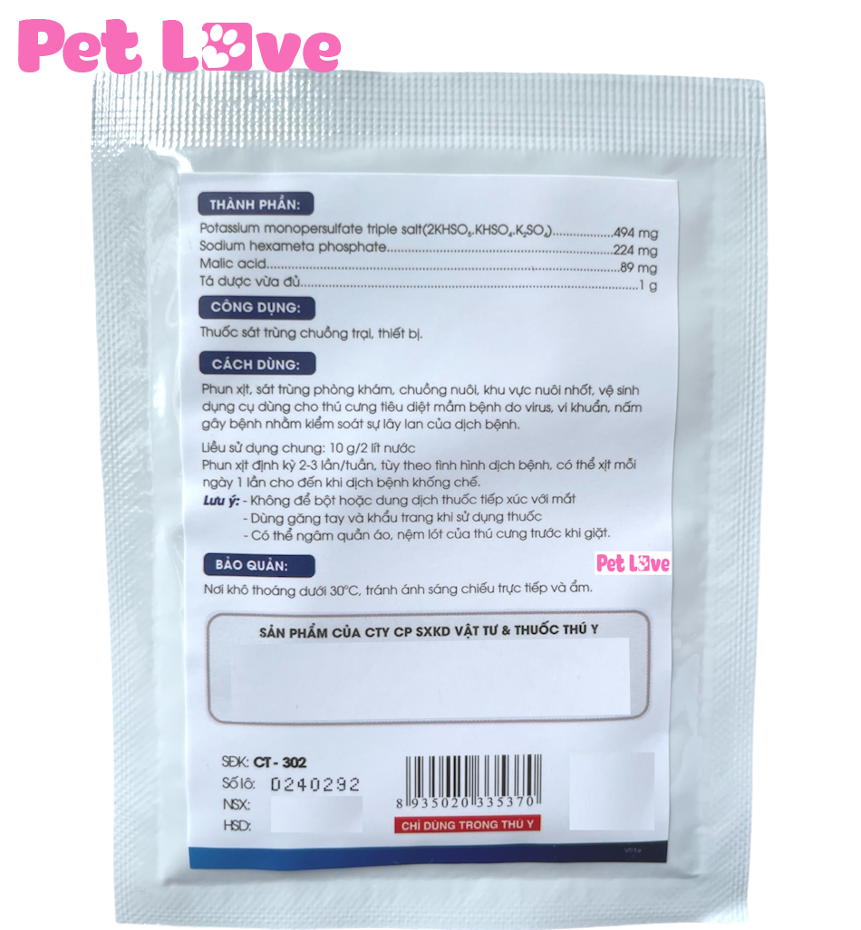 * Sát trùng phòng khám, chuồng nuôi, khu vực nuôi nhốt, vệ sinh dụng cụ dùng cho thú cưng. * Giảm mầm bệnh trong môi trường và giảm khả năng nhiễm chéo. * Sản phẩm