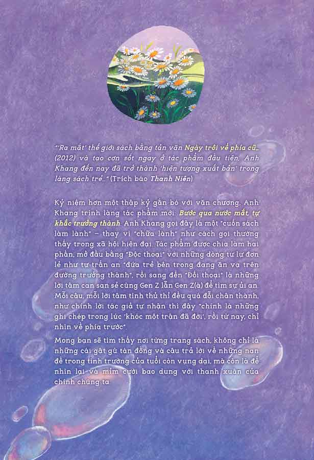 Kỷ niệm hơn một thập kỷ gắn bó với văn chương, Anh Khang trình làng tác phẩm mới: Bước qua nước mắt, tự khắc trưởng thành. Anh Khang gọi đây là một “cuốn sách làm lành” – thay vì “ chữa lành” như cách gọi thường thấy trong xã hội hiện đại. Tác phẩm được chia làm hai phần, mở đầu bằng “Độc thoại” với những dòng tư lự đơn lẻ như tự trấn an “đứa trẻ bên trong đang ăn vạ trên đường trưởng thành”, rồi sang đến “ Đối thoại” là những lời tâm can san sẻ cùng Gen Z lẫn Gen Z(à) để tìm sự ủi an. Mỗi câu, mỗi lời tâm tình thủ thỉ đều quá đỗi chân thành, như chính lời tác giả tự nhận thì đây “chính là những ghi chép trong lúc ‘khóc một trận đã đời’, rồi từ nay, chỉ nhìn về phía trước”.