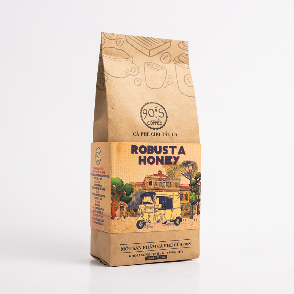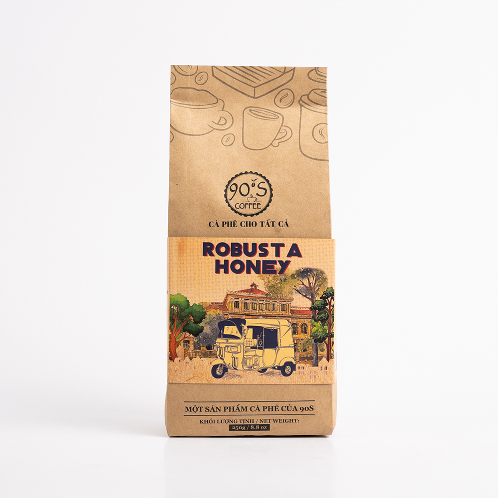 Cà phê bột Robusta Honey thuộc dòng sản phẩm cà phê rang mộc nguyên chất của 90S Coffee Vietnam. Đây là sản phẩm rất được ưa chuộng trong ngành cà phê bởi đặc tính đa dạng & sự phổ biến của nó.