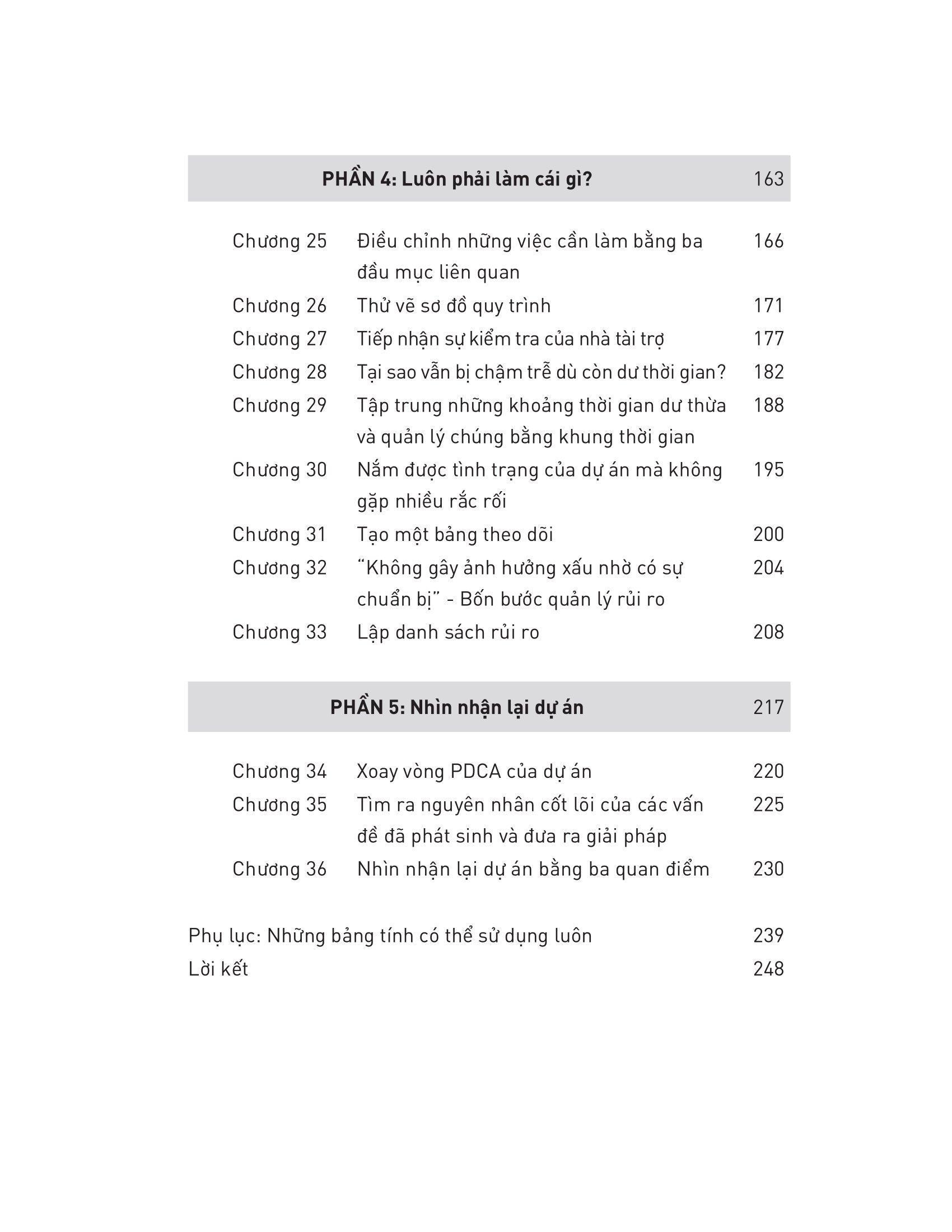 Cuốn sách đúc kết nhiều bài học hay cùng những kinh nghiệm thực tế của tác giả. Những kỹ năng, thuật ngữ quản lý công việc tưởng như khó hiểu đều được truyền đạt và diễn giải bằng ngôn từ gần gũi nhất, giúp người đọc dễ dàng nắm bắt và vận dụng. Ở cuối sách, các độc giả sẽ được cung cấp các bảng công cụ có thể đưa vào áp dụng ngay lập tức, giúp nâng tầm hiệu suất cũng như chất lượng làm việc của bản thân và đội nhóm, đem lại những kết quả hữu hình cho doanh nghiệp.